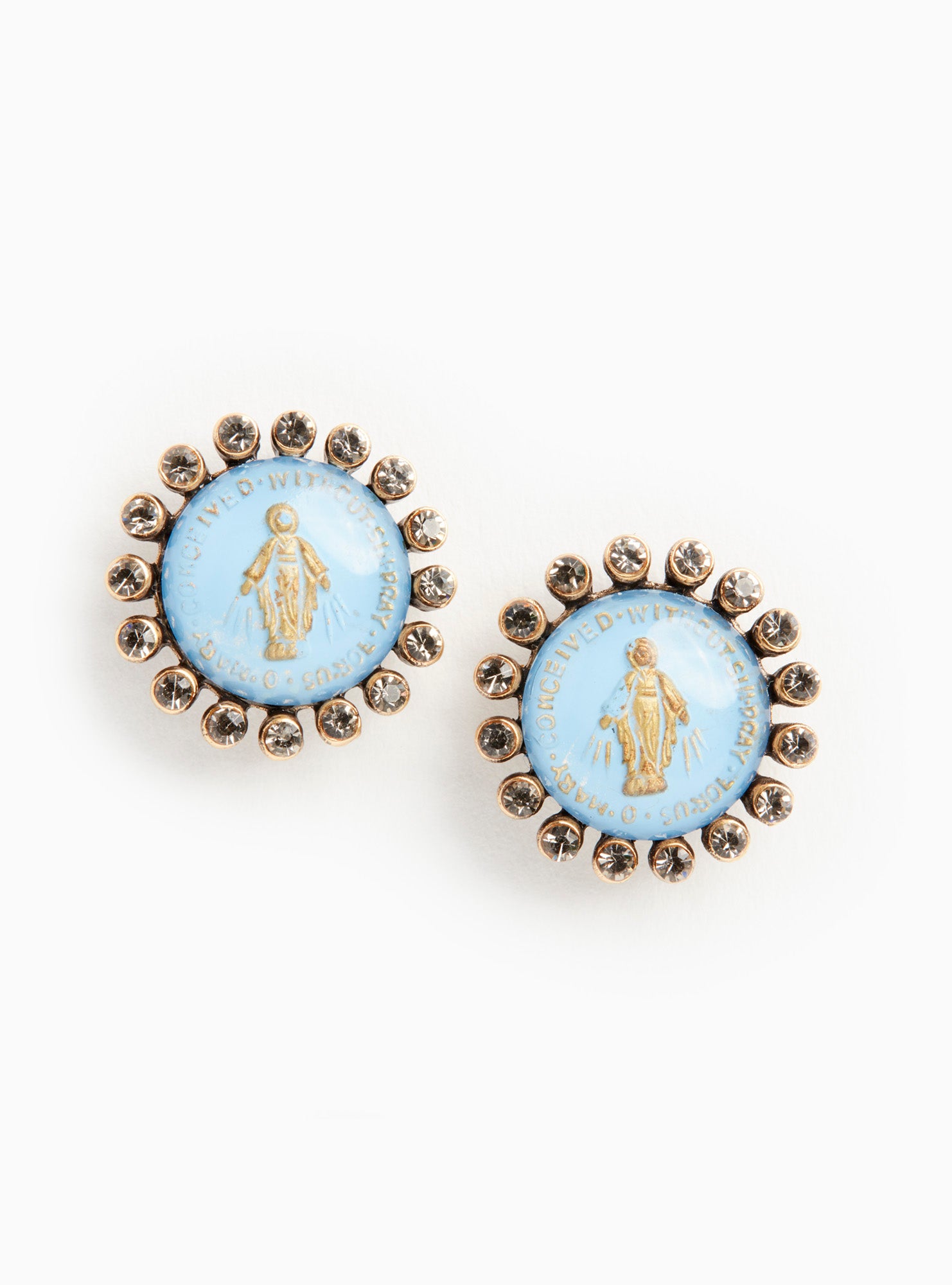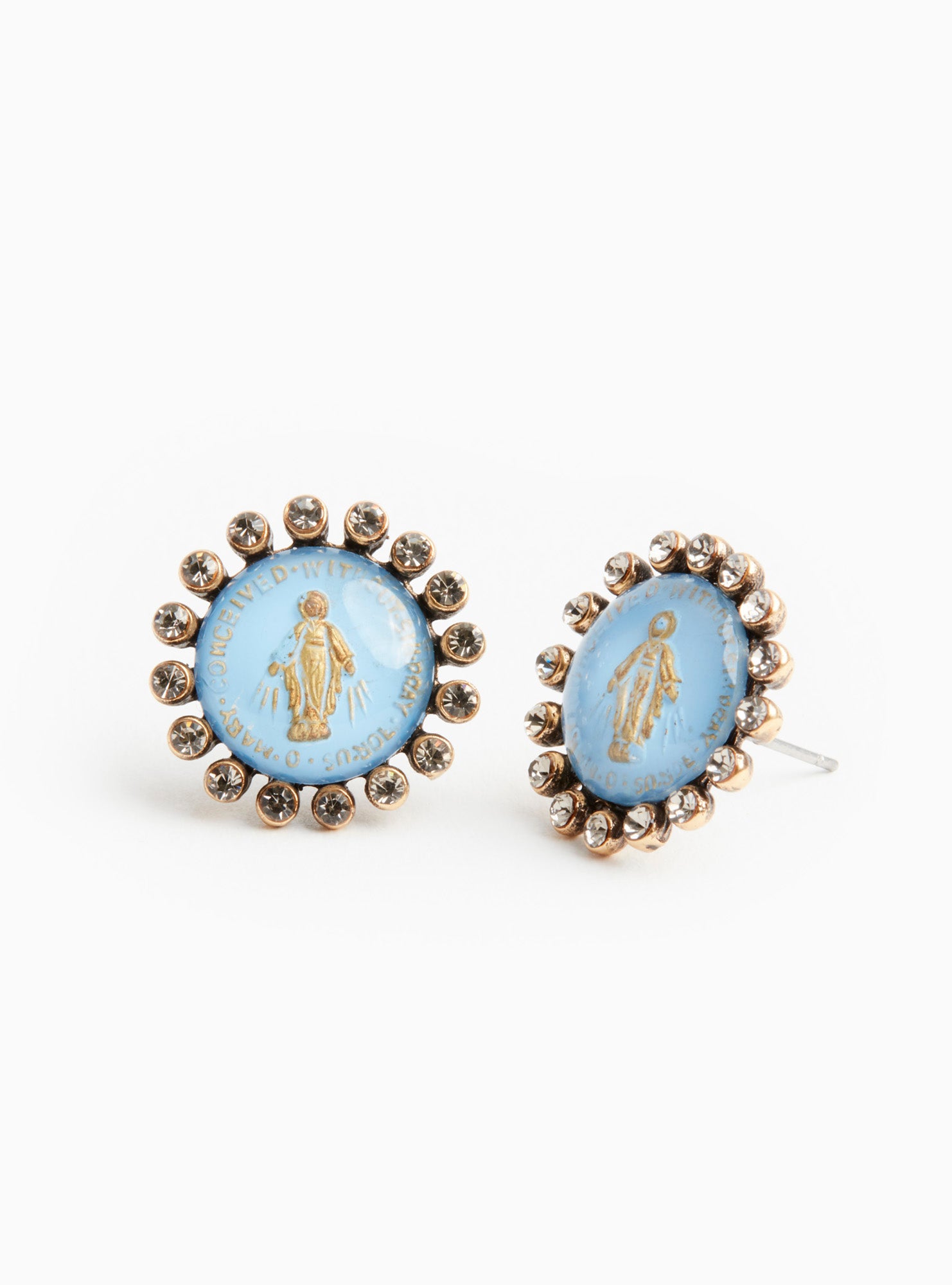 These vintage hand-painted intaglios depict a golden saint in front of a blue sky, surrounded by a shimmering gallery of stars. The name of the earrings, Mixta Persona, stems from a traditional Russian coronation in which the ruler was considered “part priest and part layman, but never fully whole.”