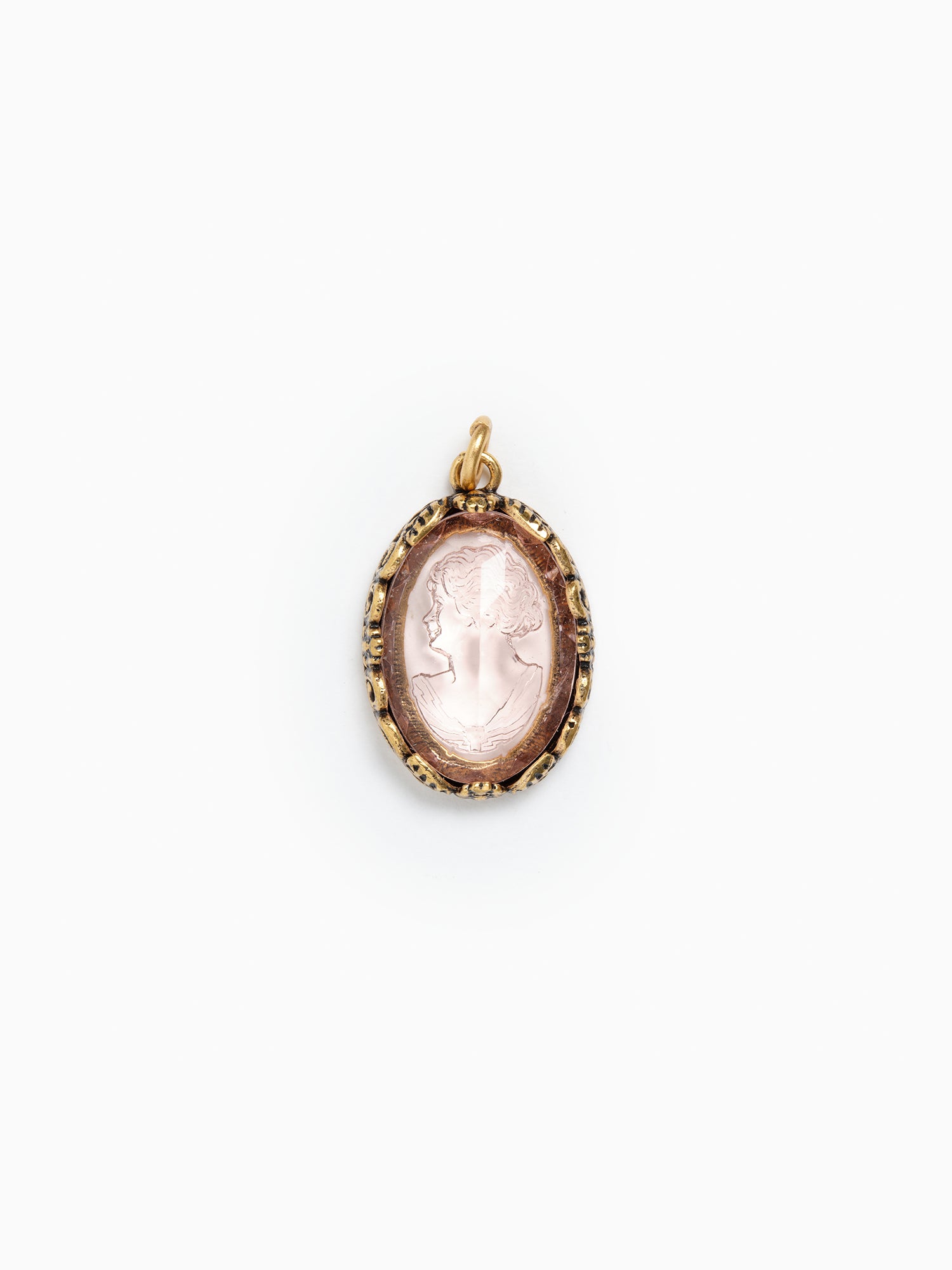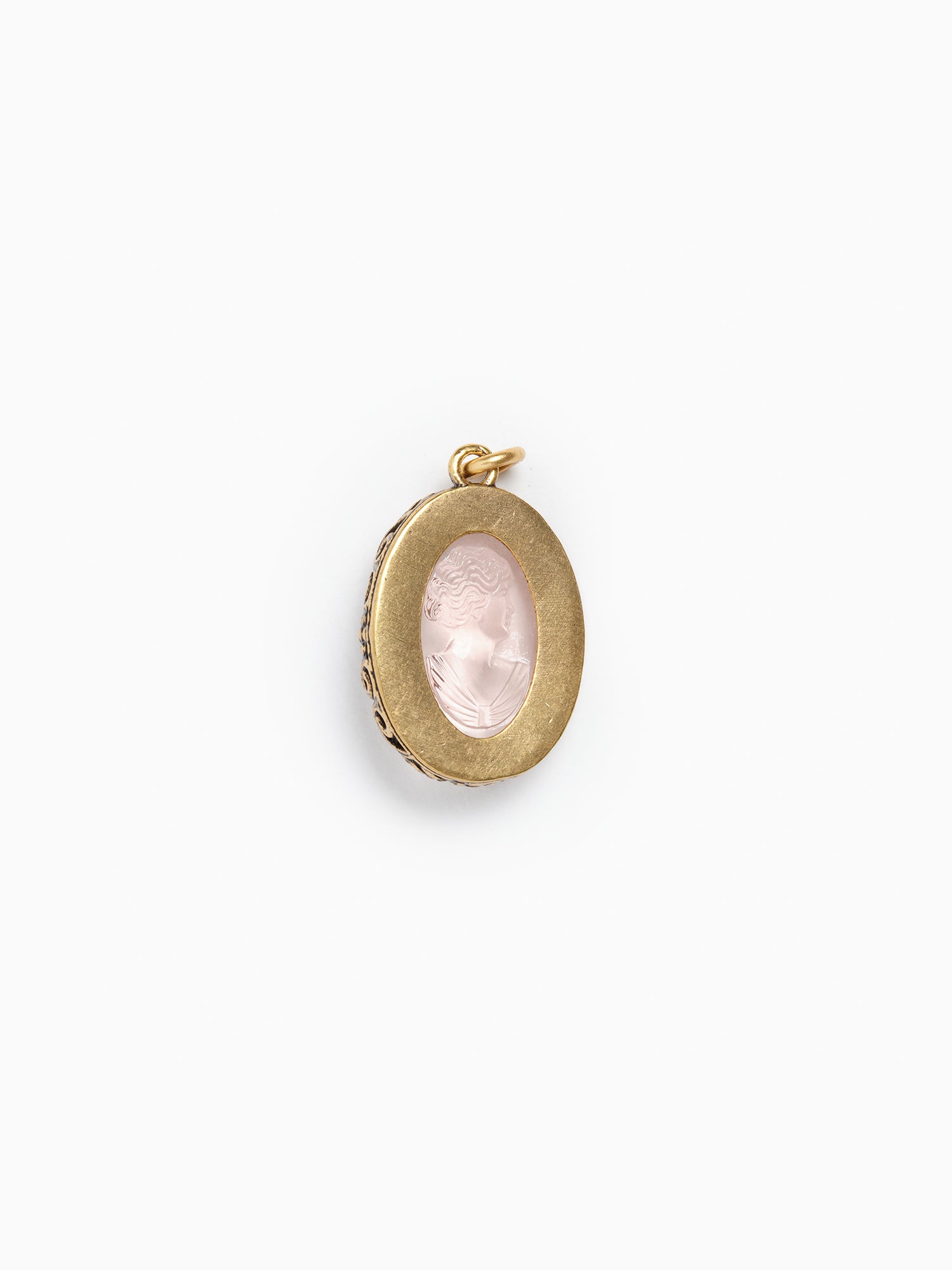 Flash plated antiqued gold over brass, Rosaline Glass German glass cameo