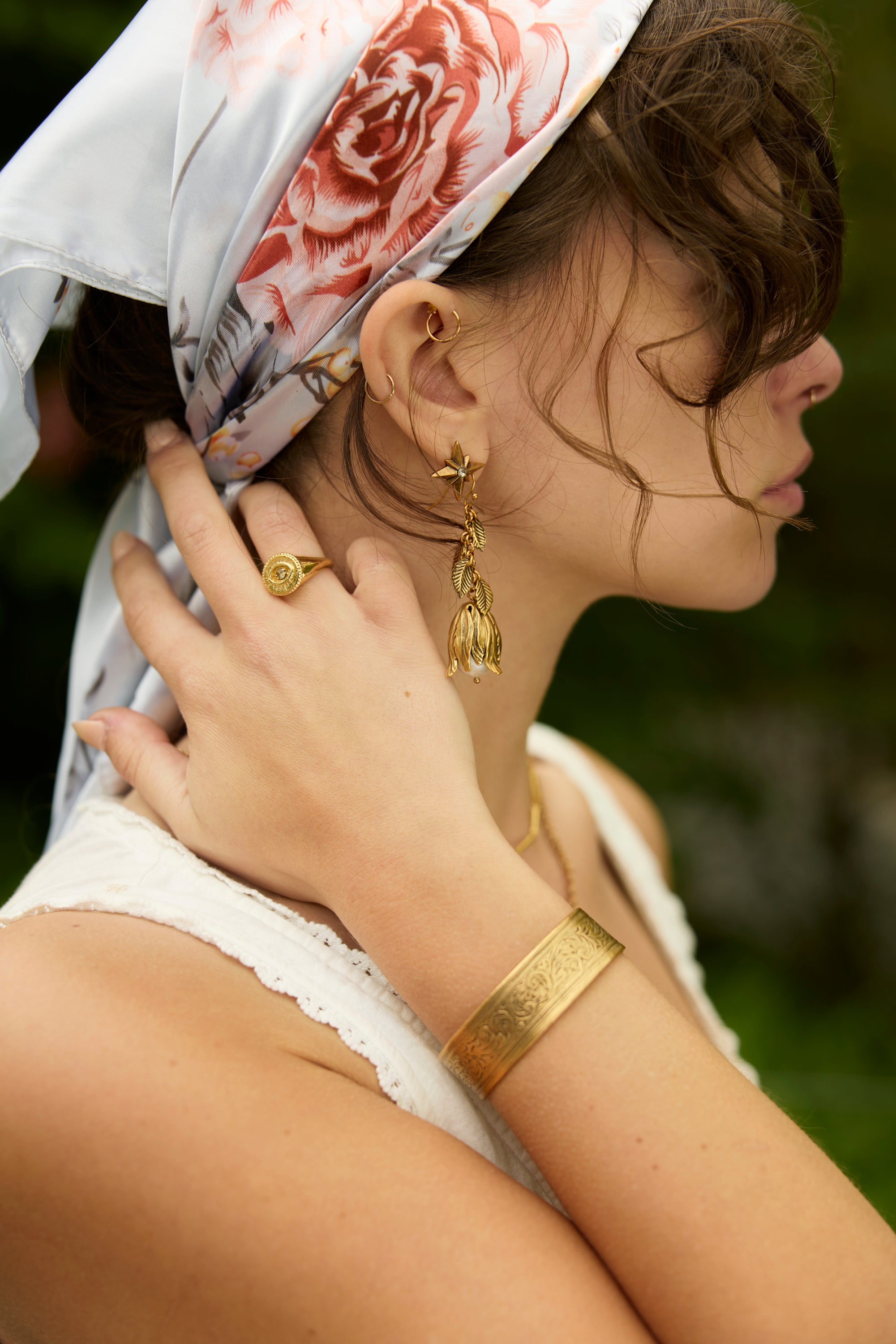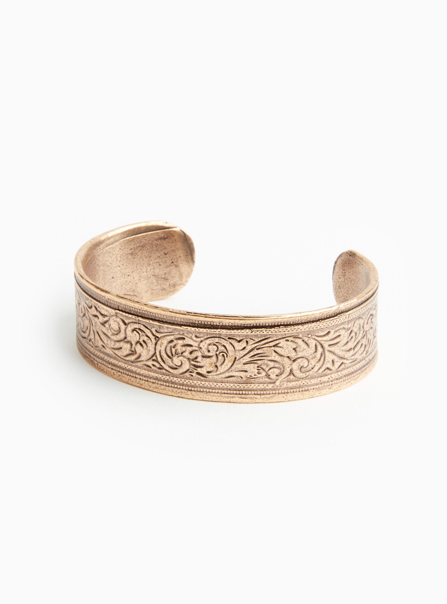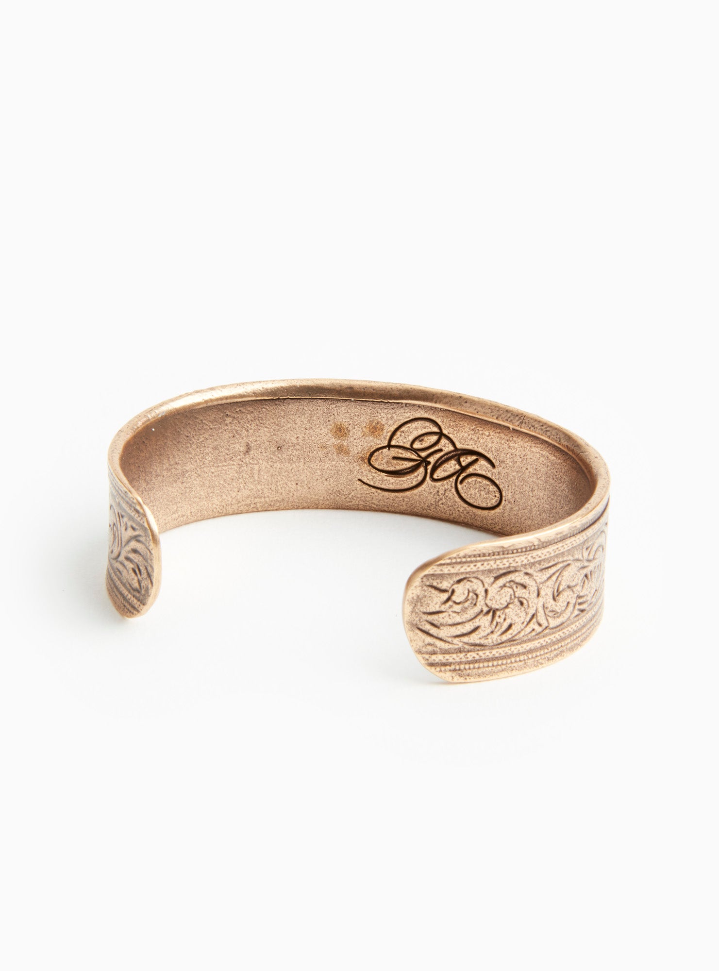 In a court gleaming with gold, harboring extravagance down to the finest detail, this hand-engraved cuff is elegantly rendered to add a kiss of refinement to any ensemble.