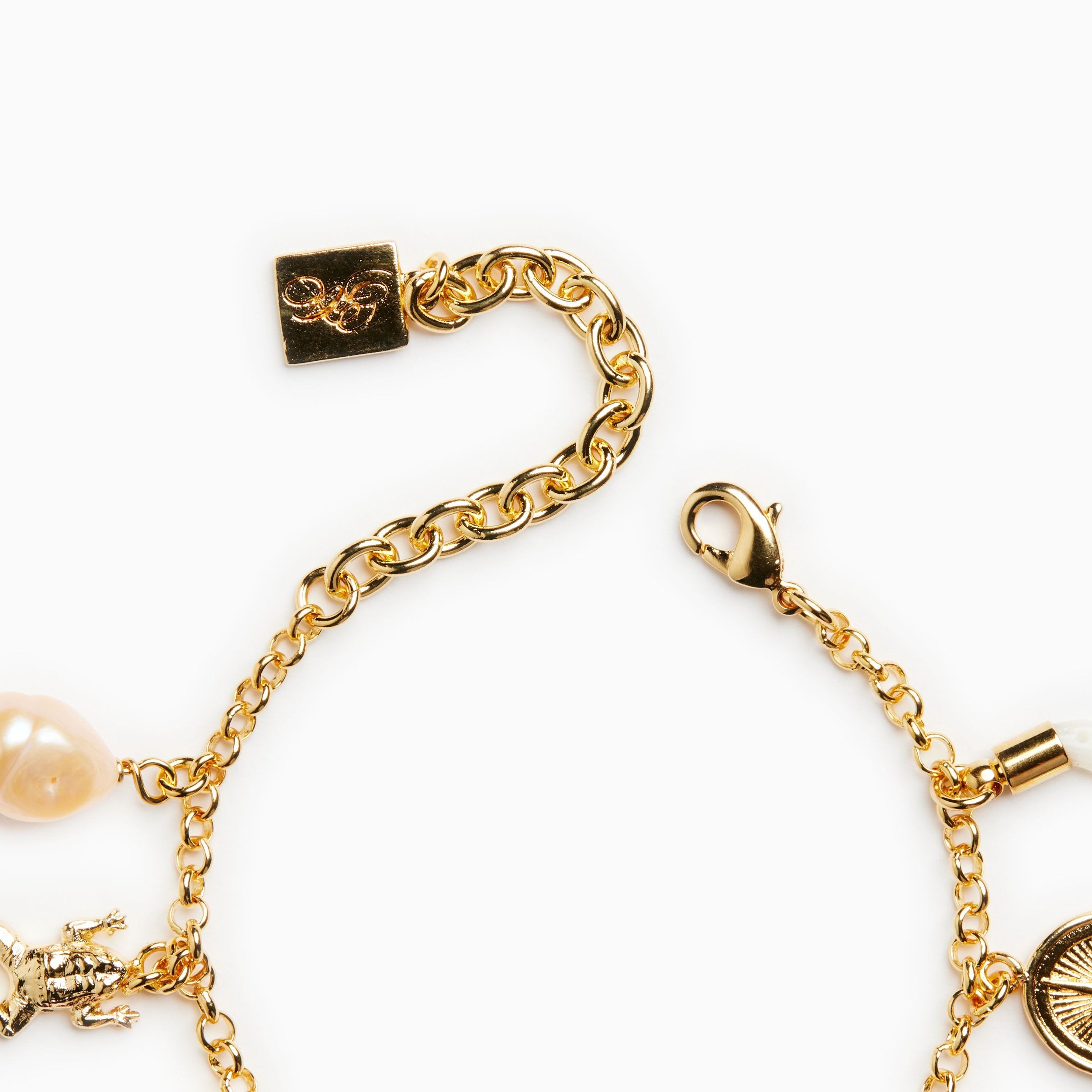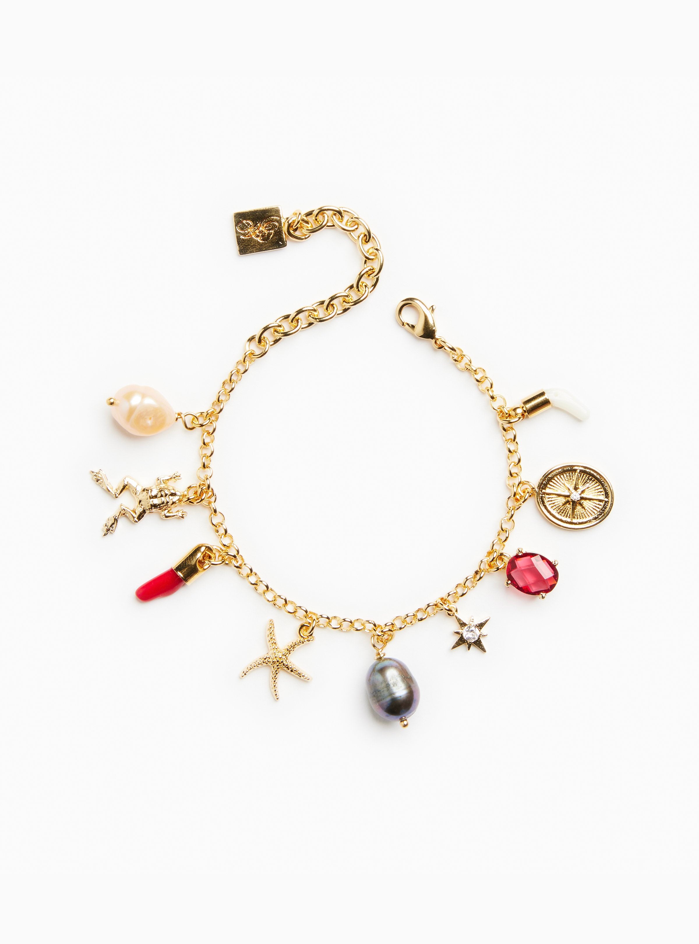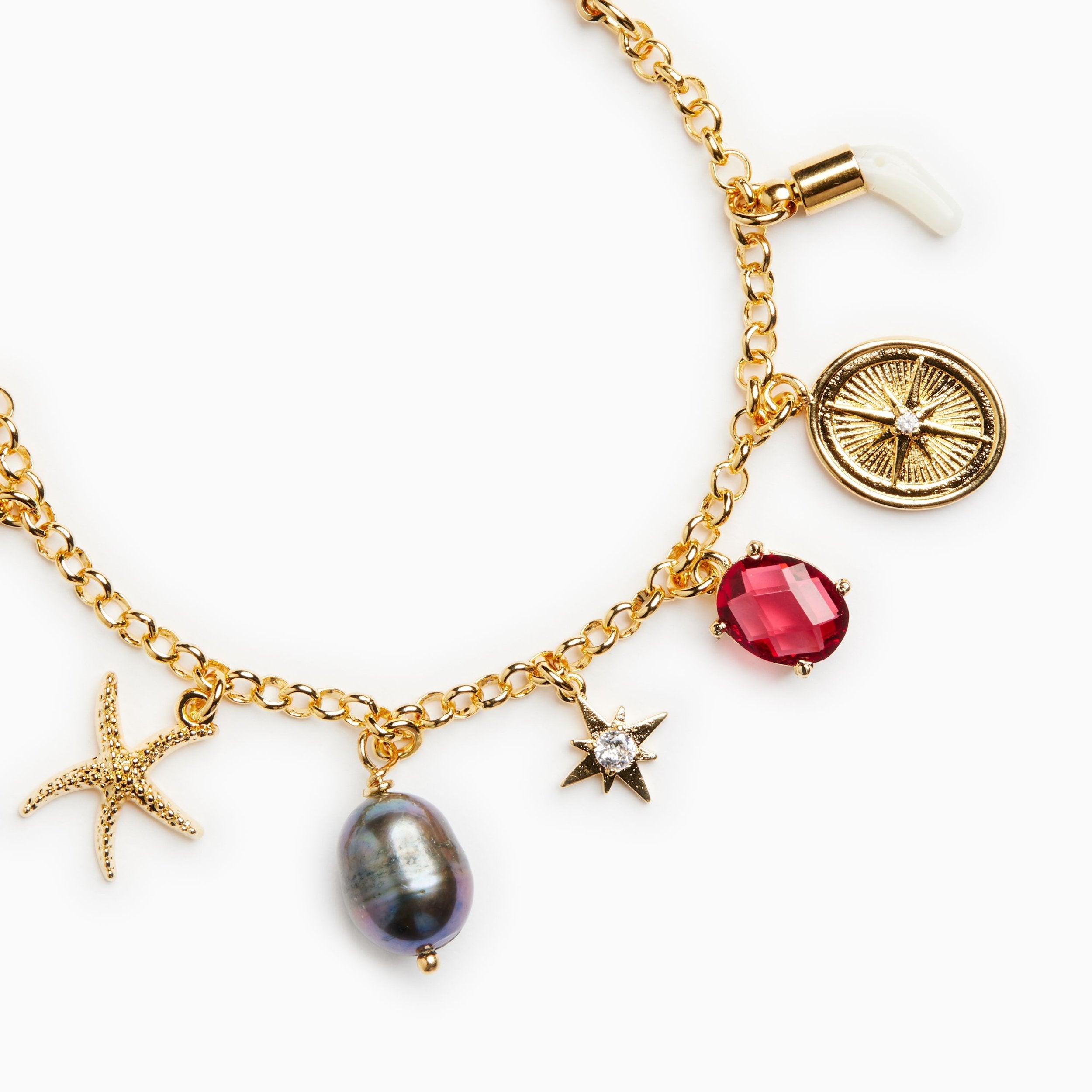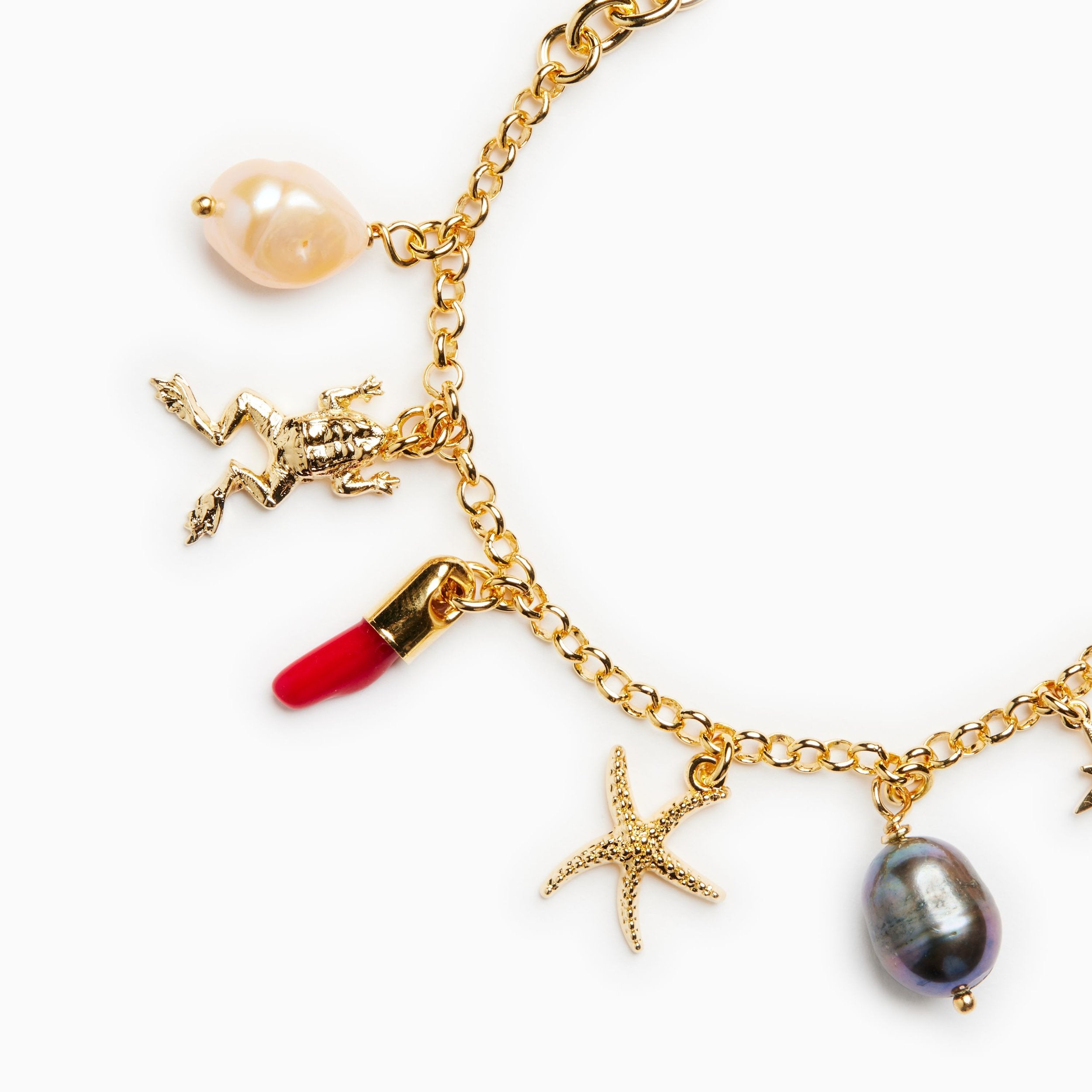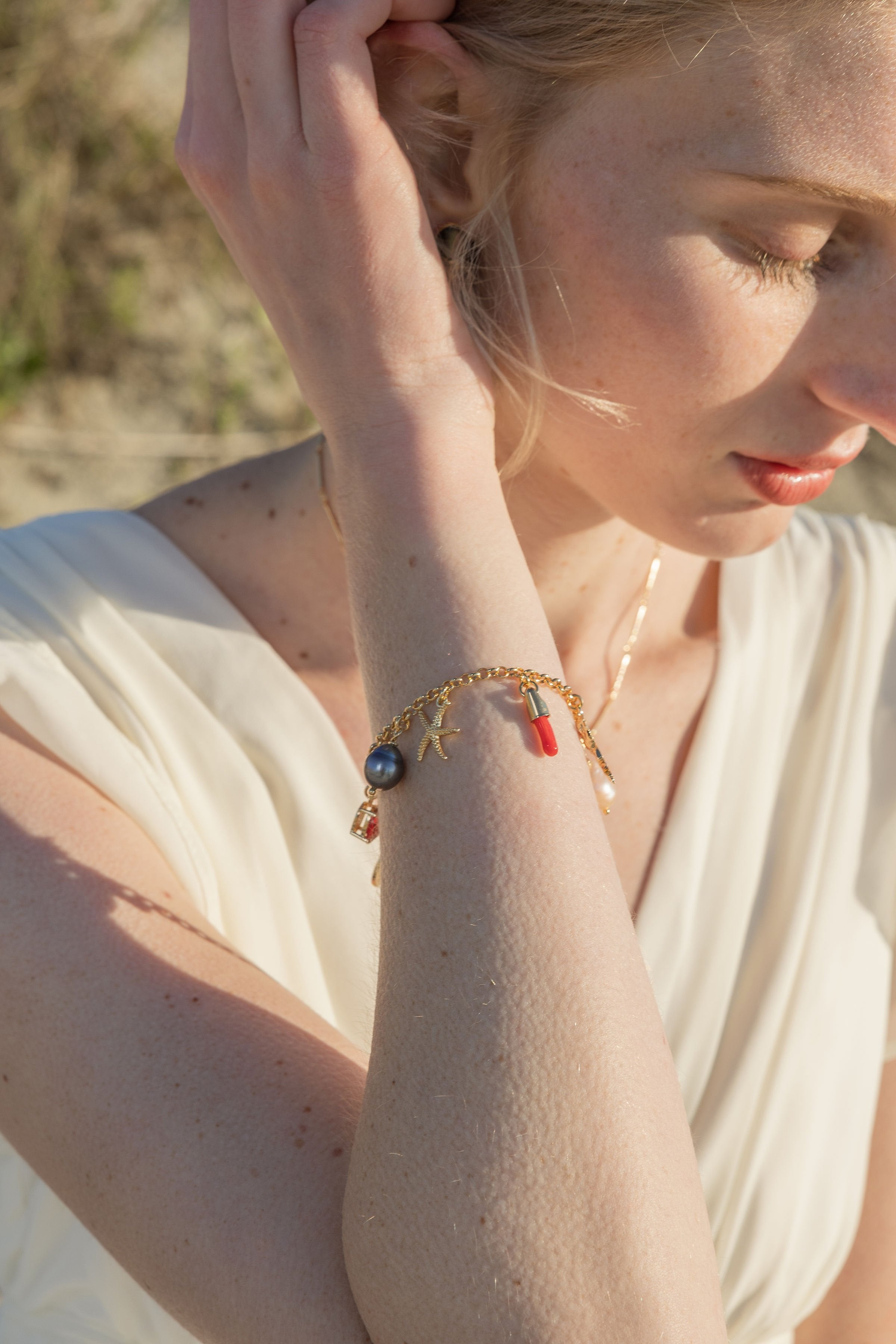 A playful scattering of charms and light dwells on the sea collector’s wrist, gathered from coastal waters in a glittering song of the sea. Pearls for wisdom, a compass to navigate the stars, glass stones, and golden creatures all linked on the same chain.