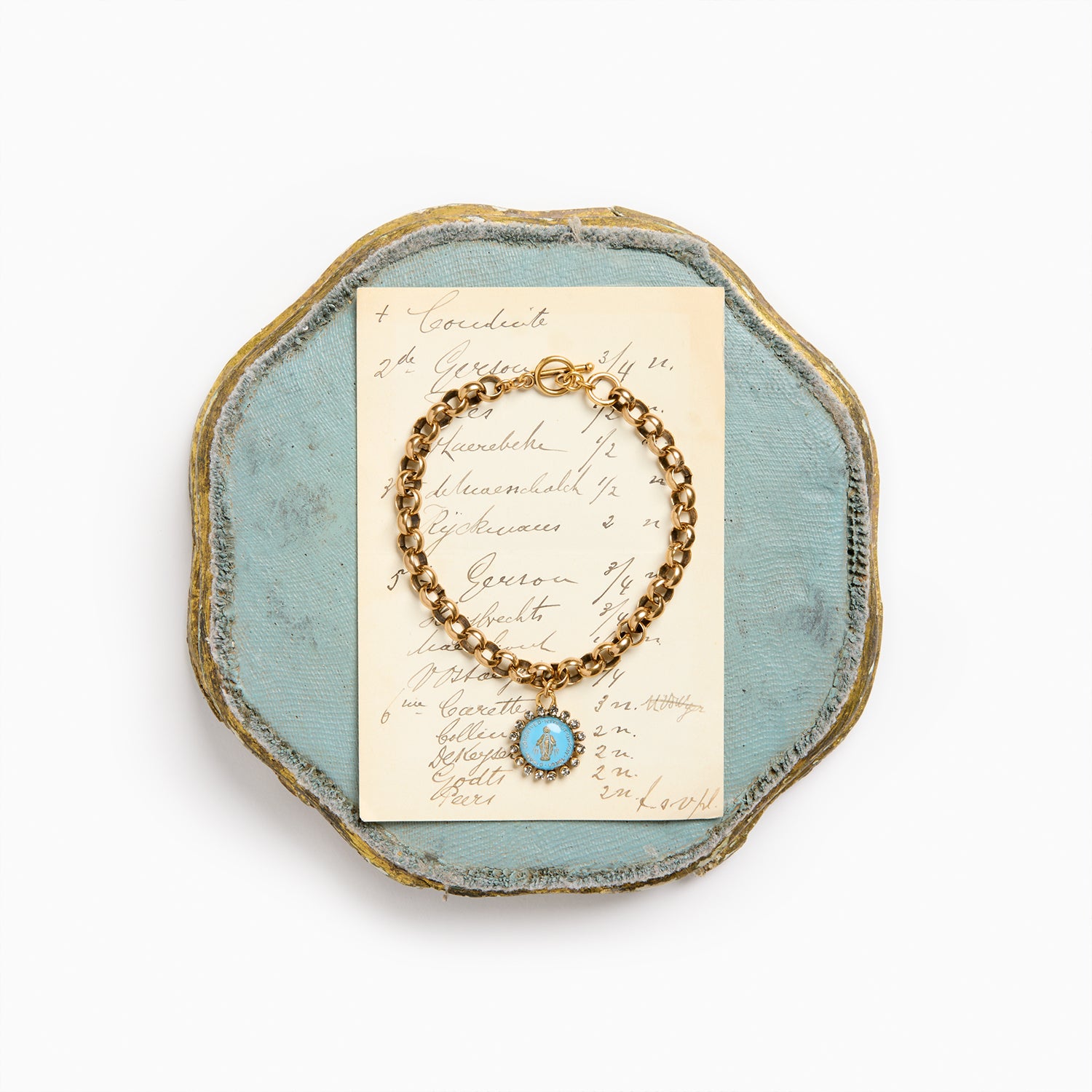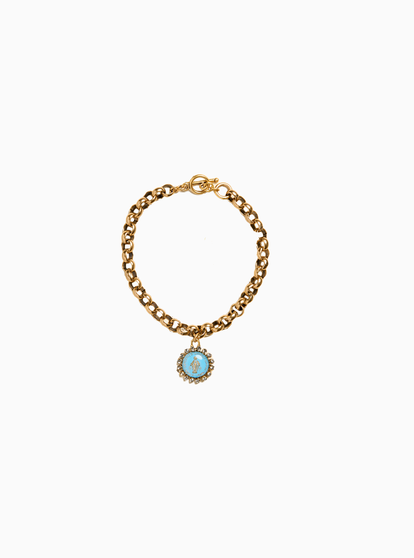 This vintage-cast, hand-painted intaglio depicts a golden saint in front of an enamel blue sky, surrounded by a shimmering gallery of stars. A part of our Romanov collection, the charm's name stems from a traditional Russian coronation.