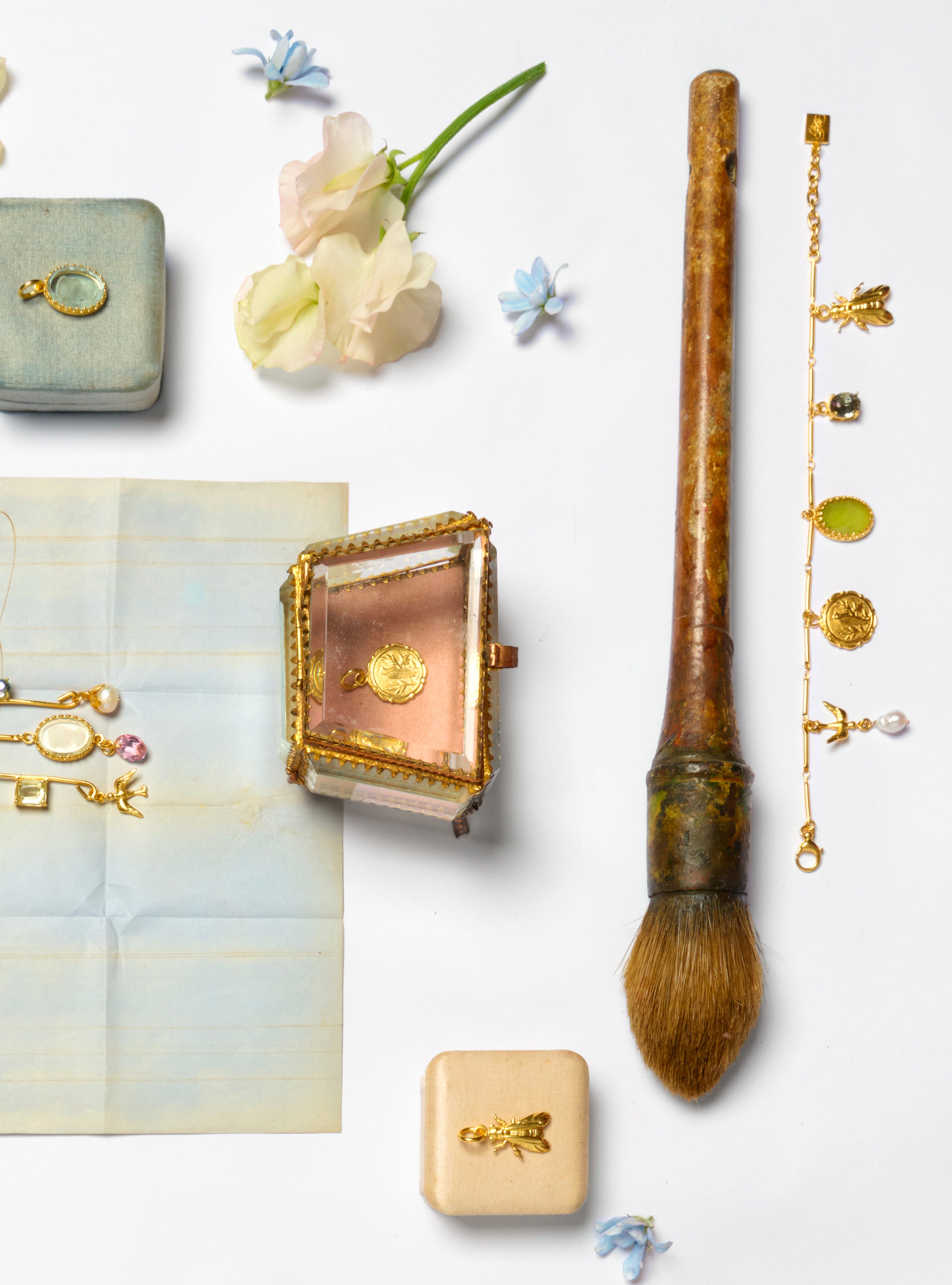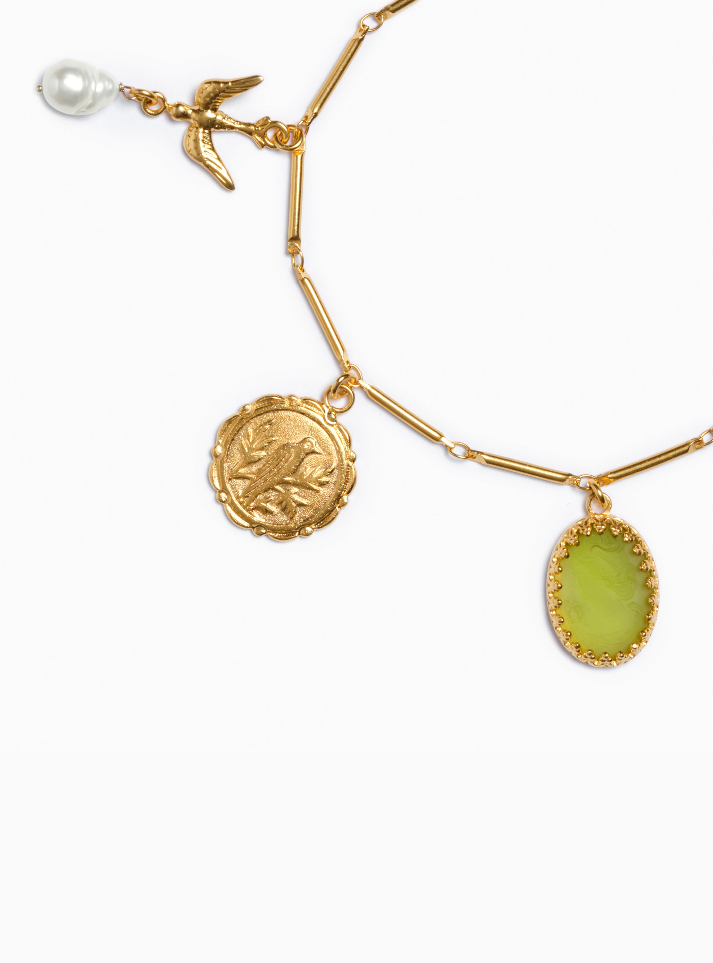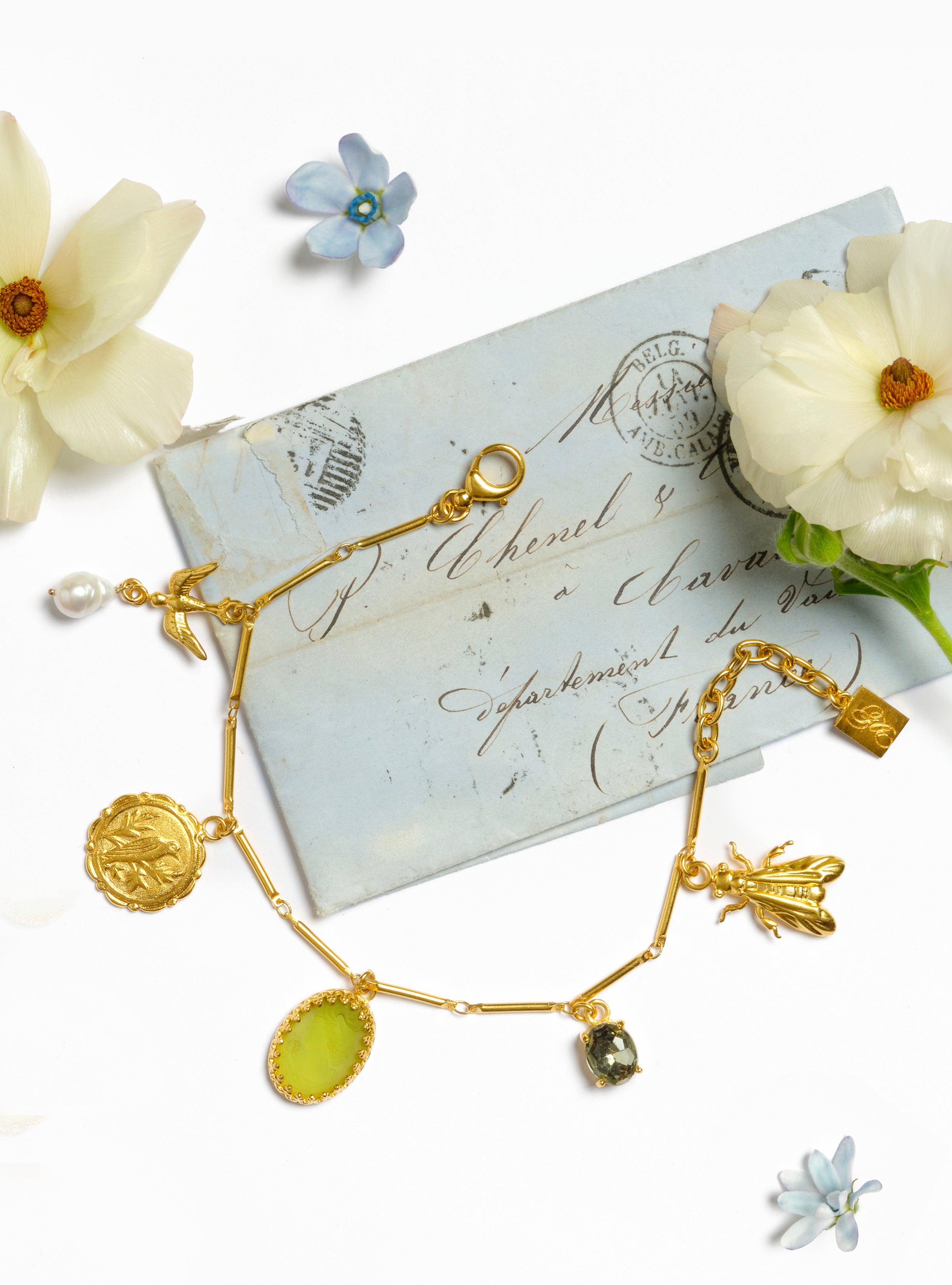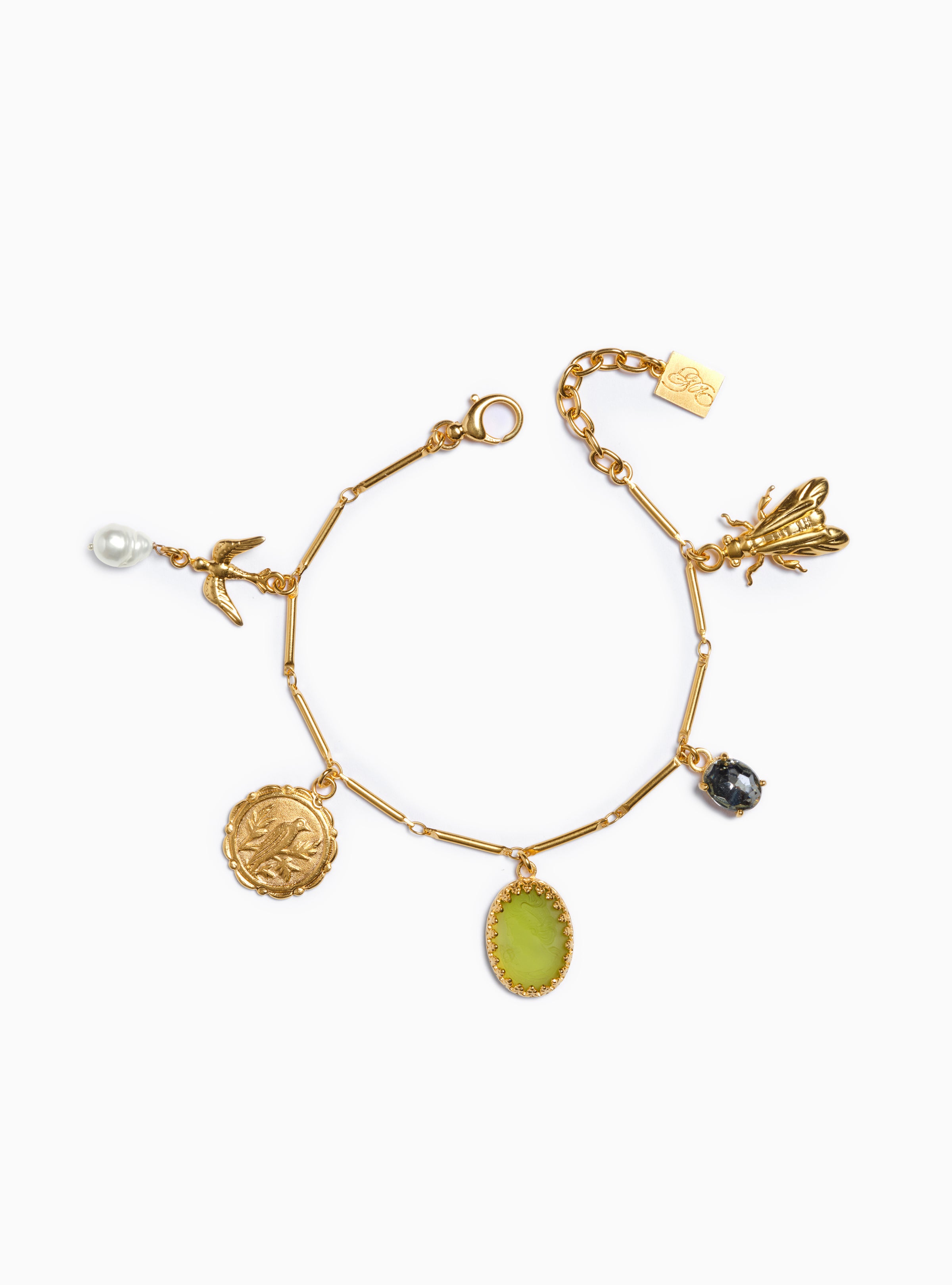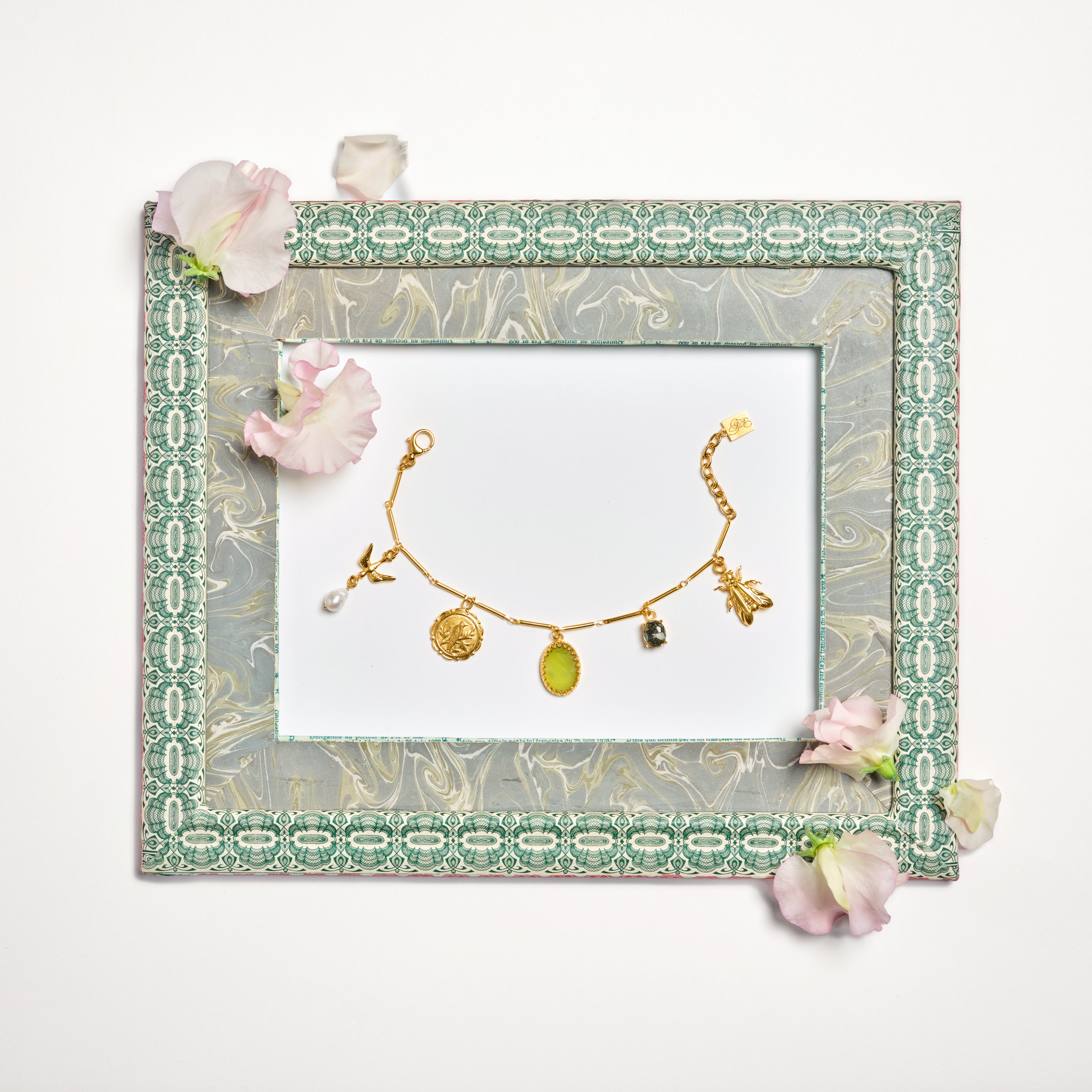 Delicate yet powerful, this bracelet is inspired by the Jardin de Tuileries, where beauty and nature entwine. Five charms, each a tribute to spring’s renewal grace the slender chain. A golden bee represents longevity, while an olive green cameo whispers wisdom. Pearls symbolize purity, and birds flutter for freedom. Together, these symbols of rebirth and creativity are linked by vintage charms sourced from France, Germany and Austria, each capturing the spirit of a garden in bloom.