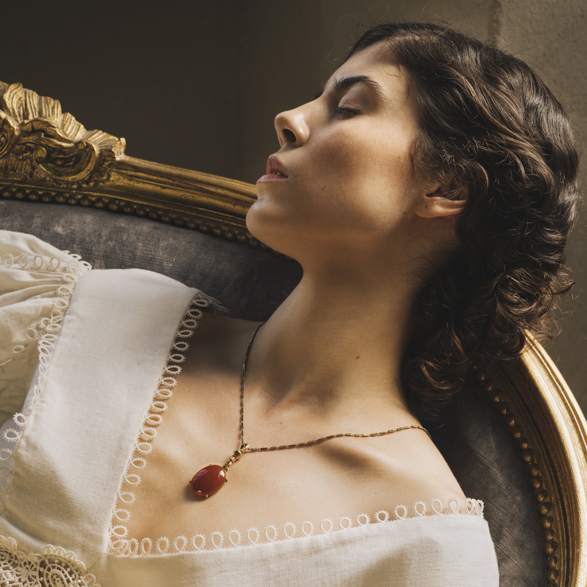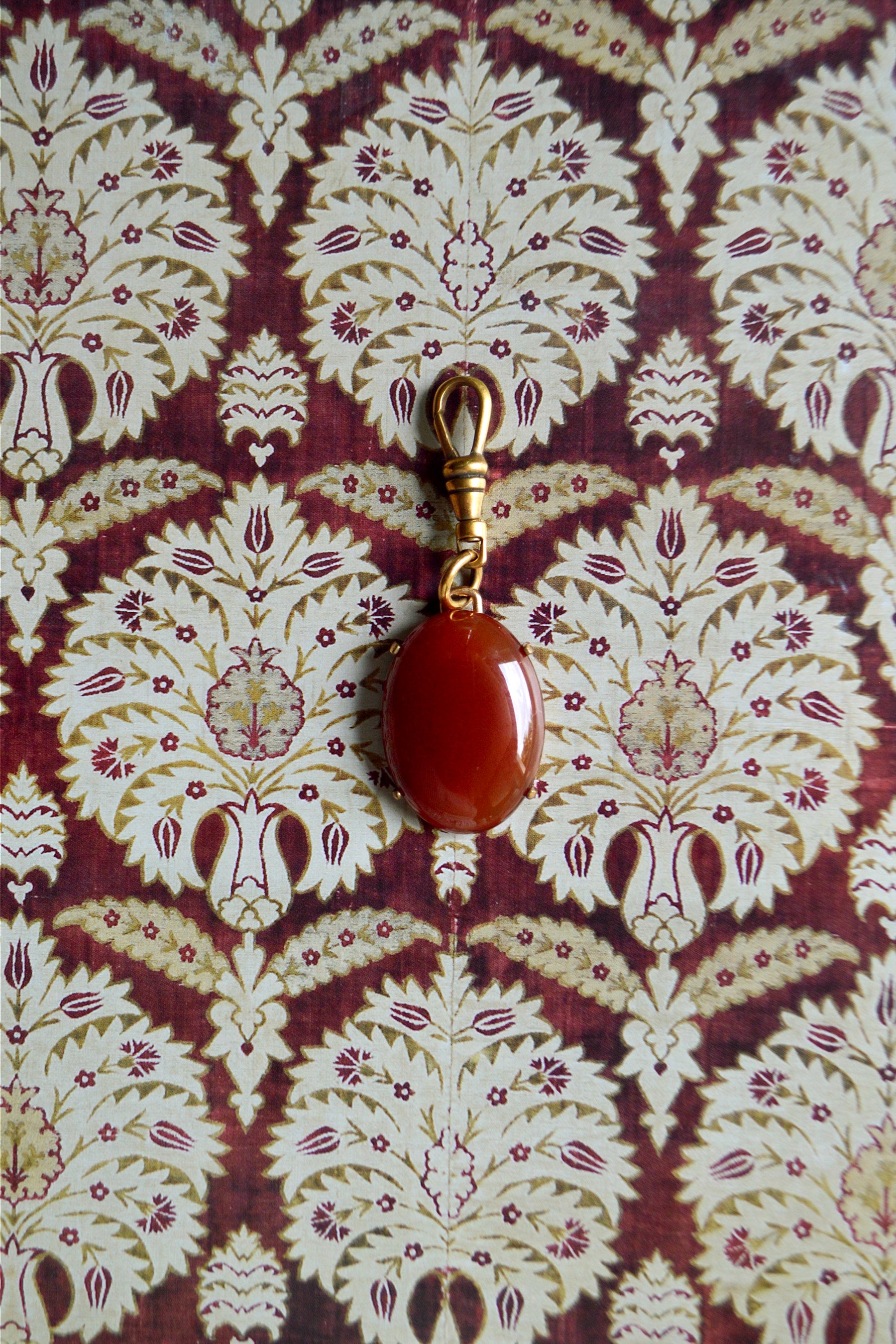 This genuine carnelian cabochon has been known to encourage creativity, courage and positive energy since the age of antiquity. Fashioned into a pendant, it may be worn at the end of a singular chain or among a collection of charms at your wrist.