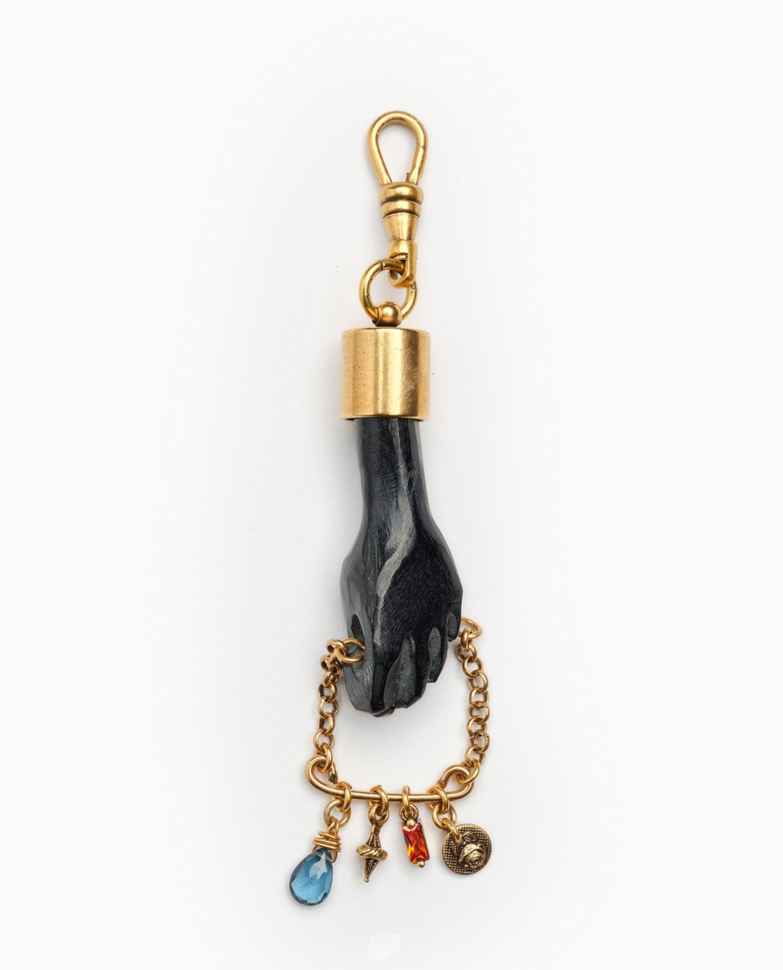 The figa sign has been used across cultures to strike messages both playful and powerful, offering protection to all who wear it. This charms made of reconstructed jet holds delicate chains with additional trinkets and jewels.