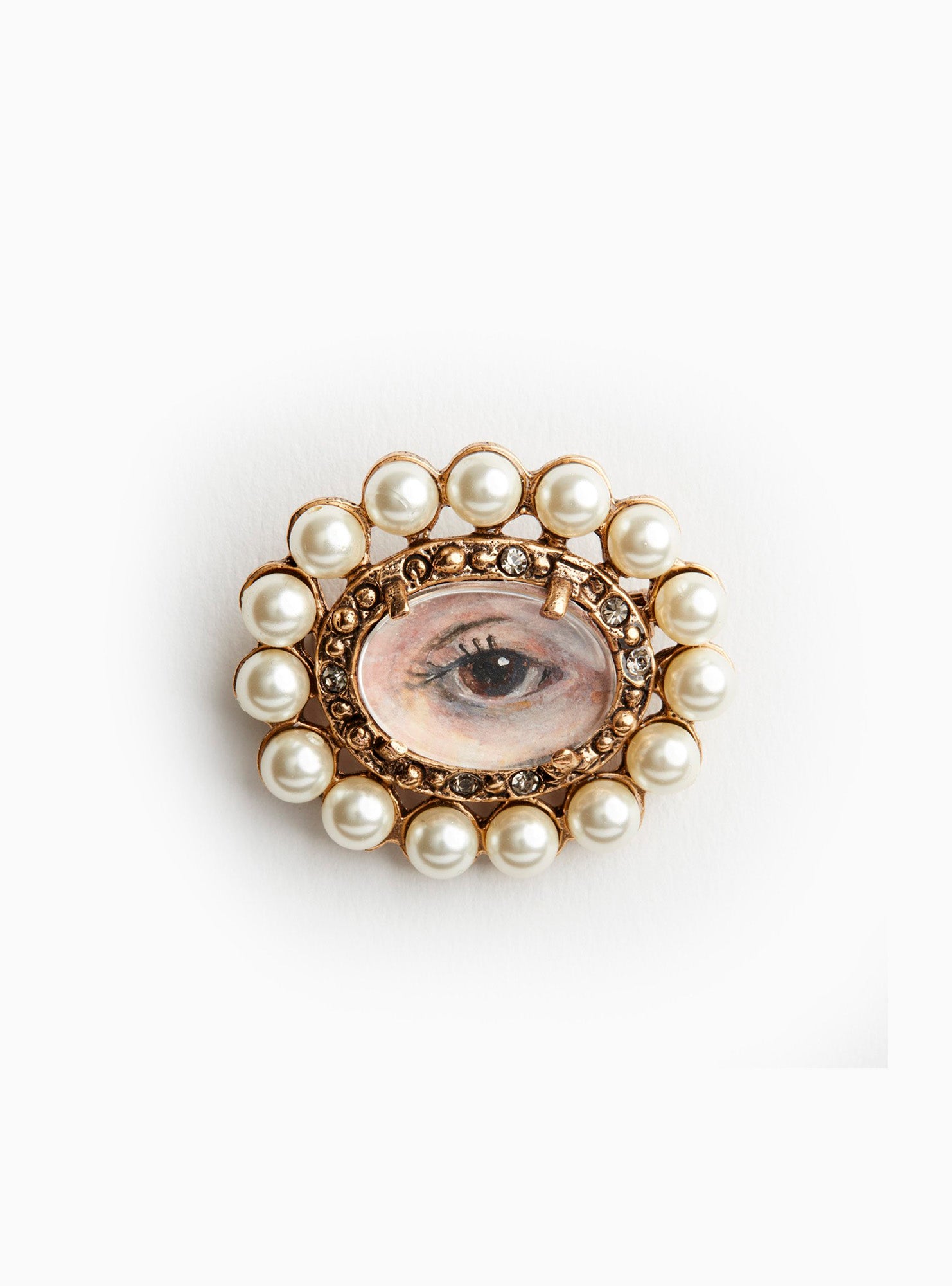 A charming recreation of the traditional Lover’s Eye jewelry begun in 1785, with the illicit love affair between a widowed commoner and the Prince of Wales. Framed in glass pearls and backed by antique textiles, our romantic take on a Lover’s Eye is painted by a local Savannah artist.