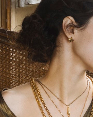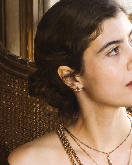 These starry studs are a musing on the Bonaparte dynasty’s coat of arms, signifying strength and grace on the long path to destiny. Cast from vintage, metal charms found in the brocantes of France.
