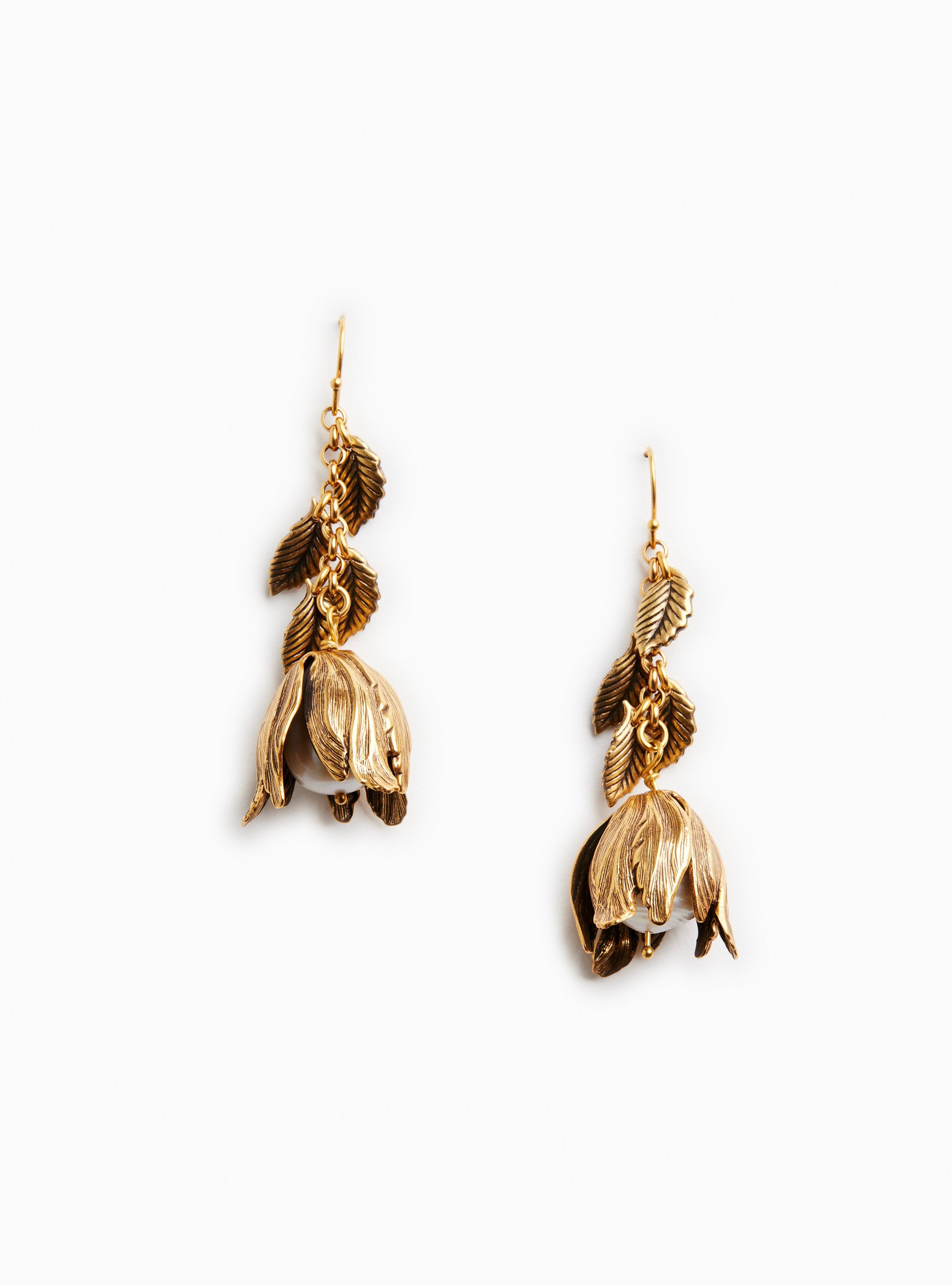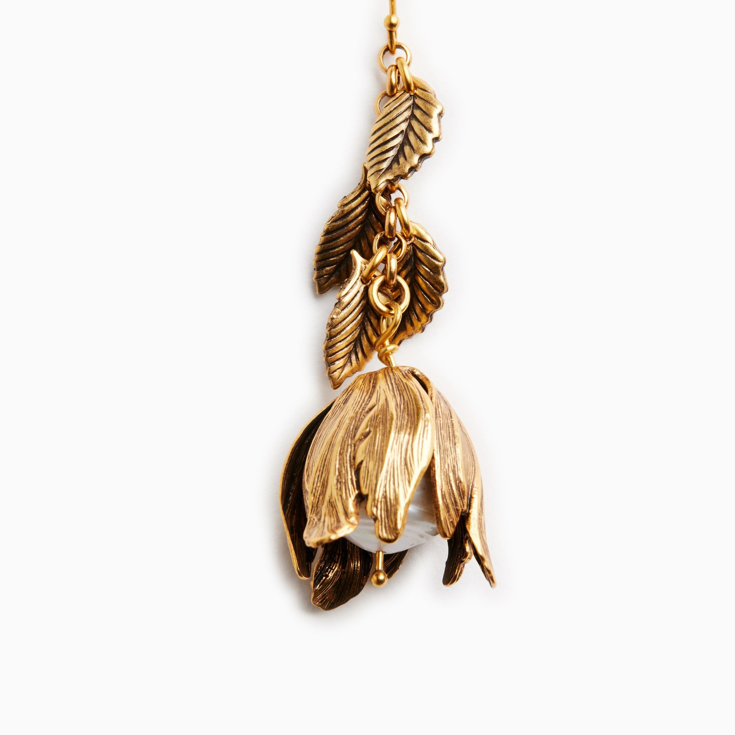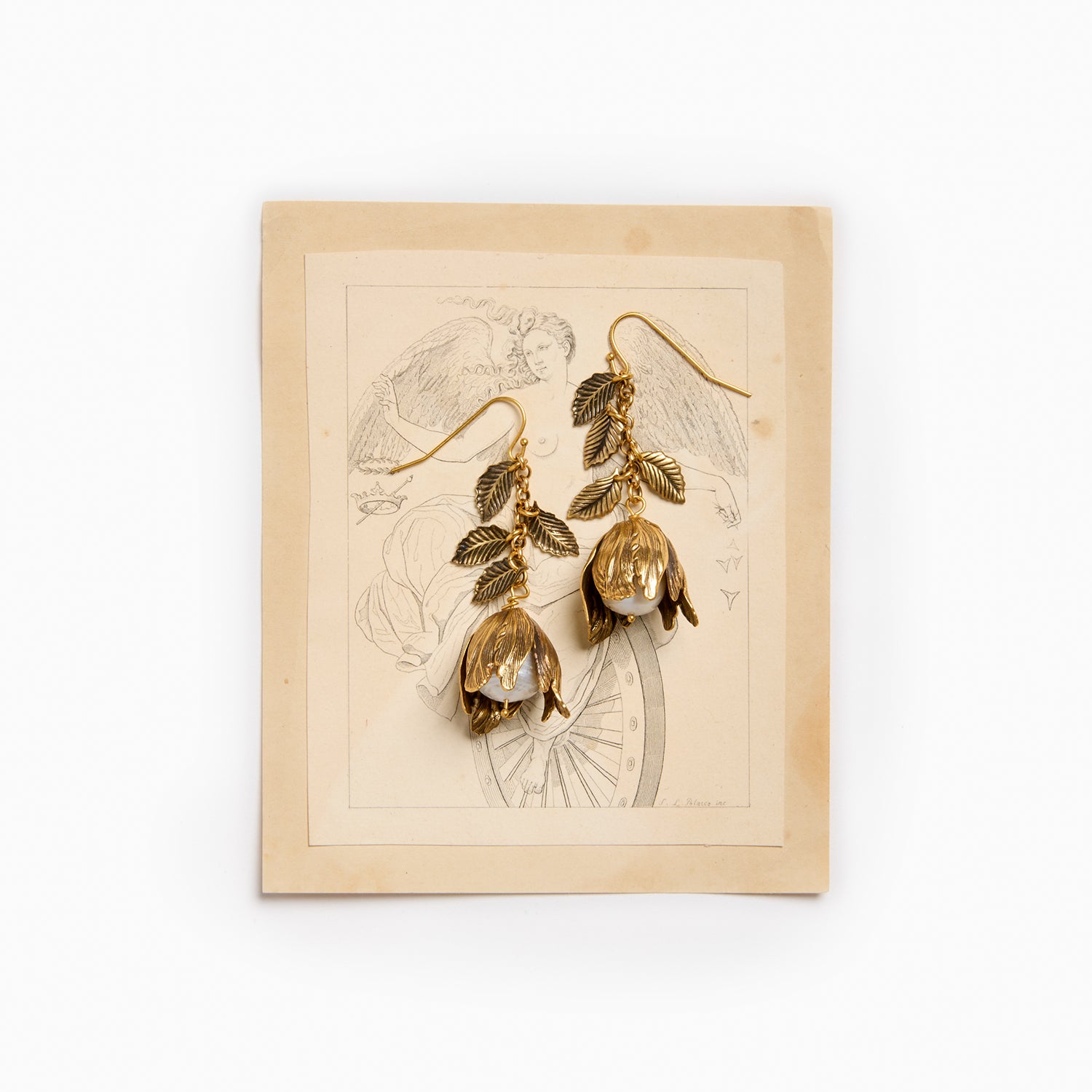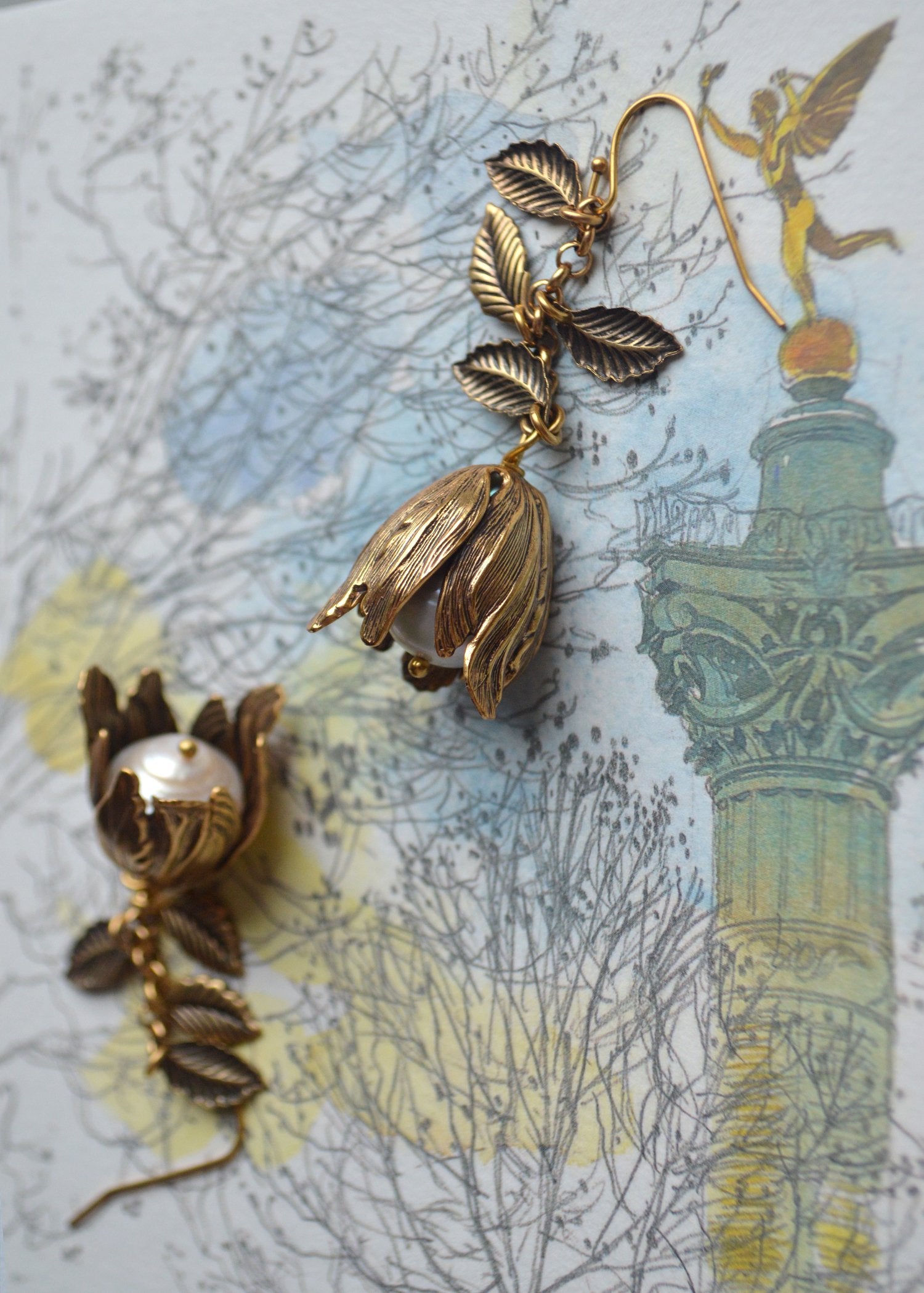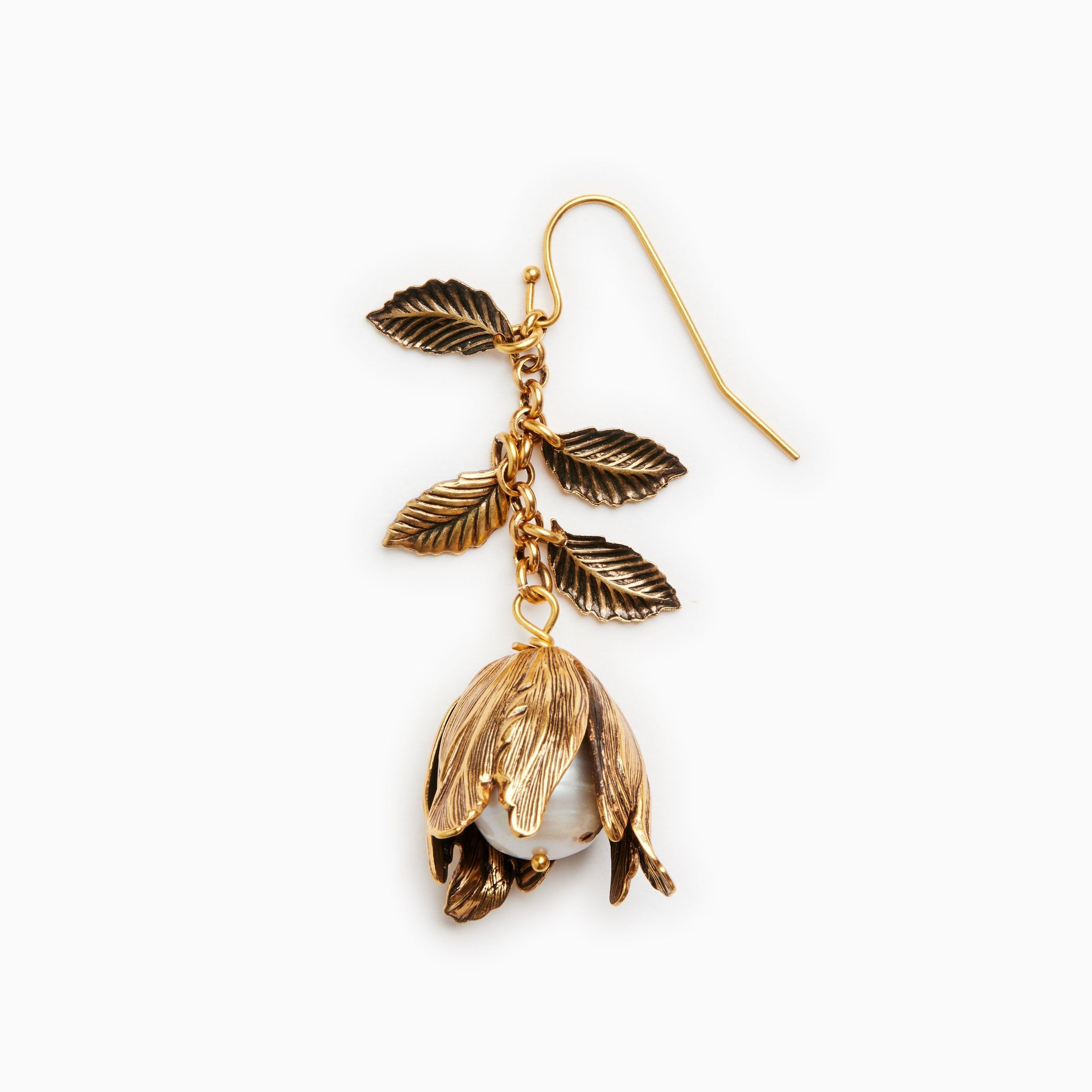 Flash plated antiqued gold over brass; freshwater pearls; 4 individual leaves