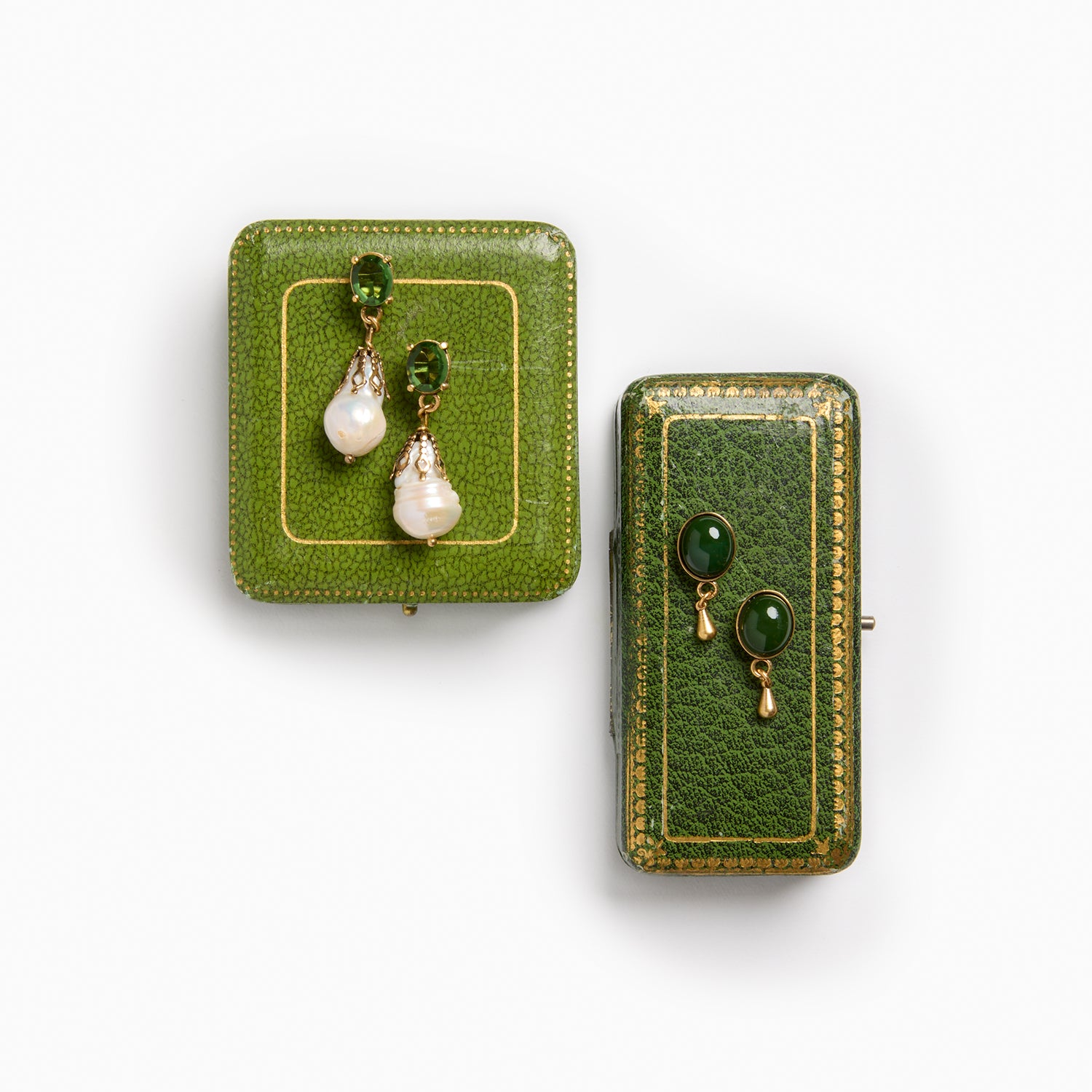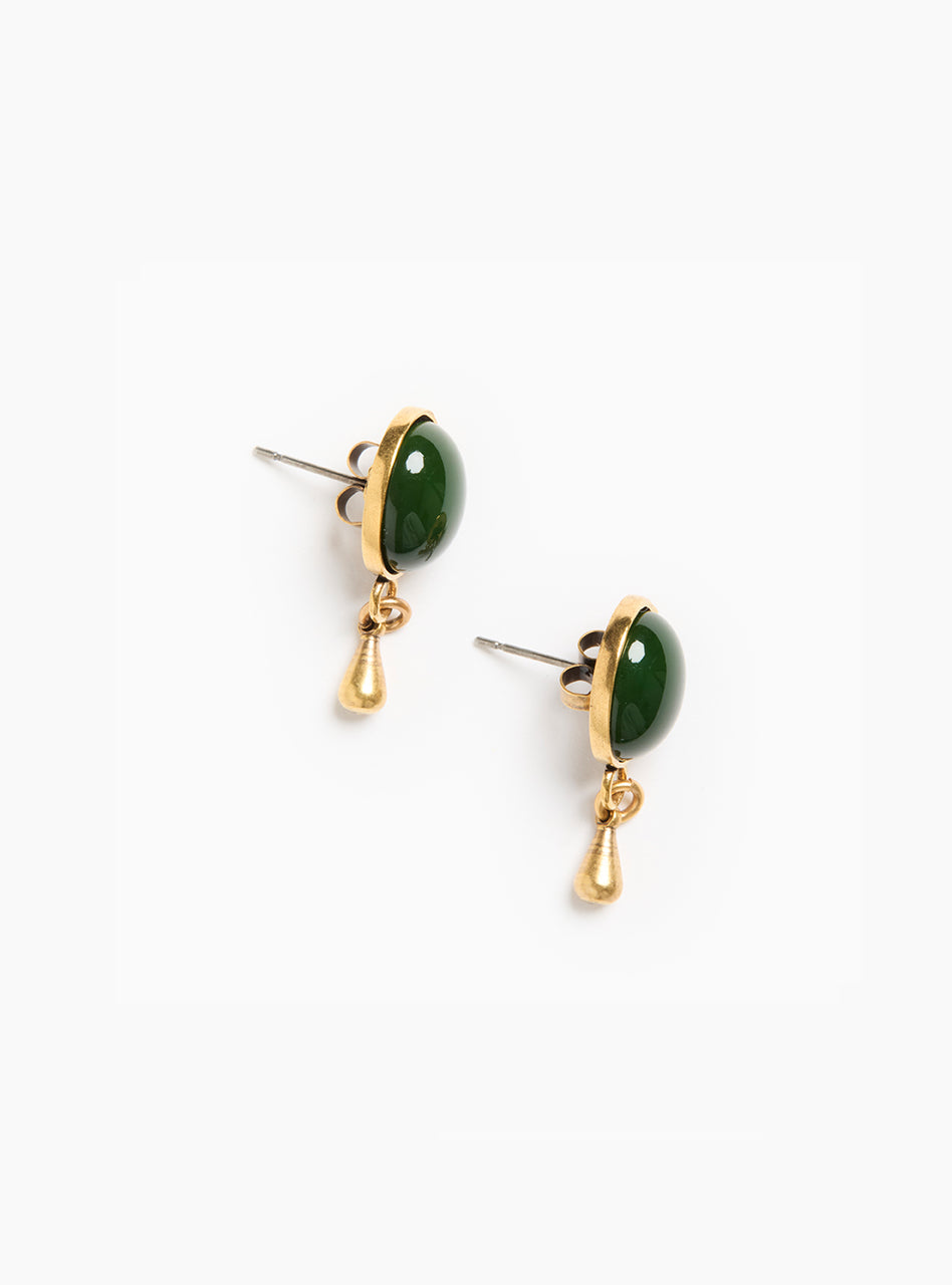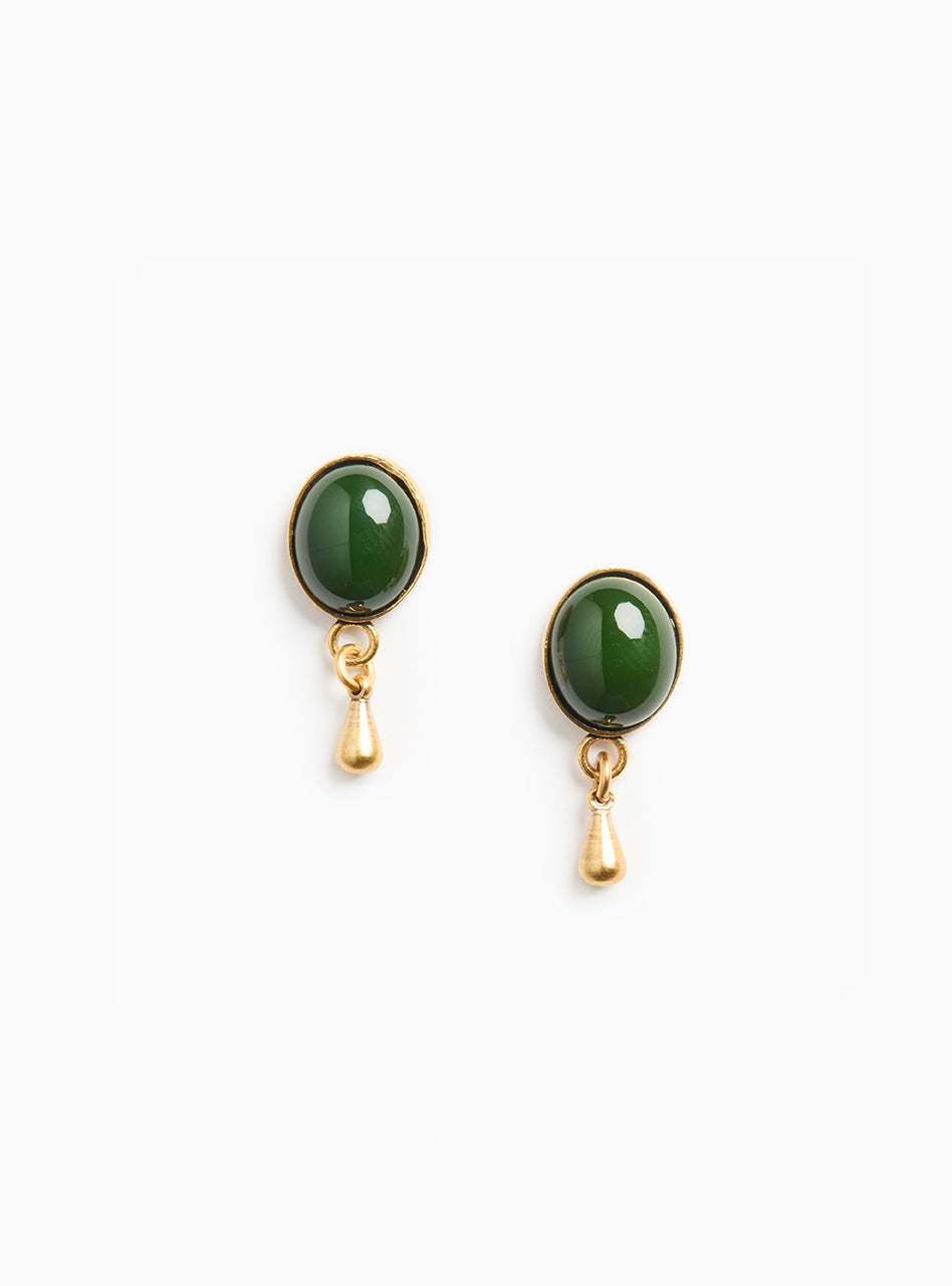 Inspired by the quietly romantic, brass-drop earrings and mossy shades of green found in oil paintings across Europe, these earrings feature the same green charm as our Aristocrate pieces hold, but with a delicate golden drop hanging from below.