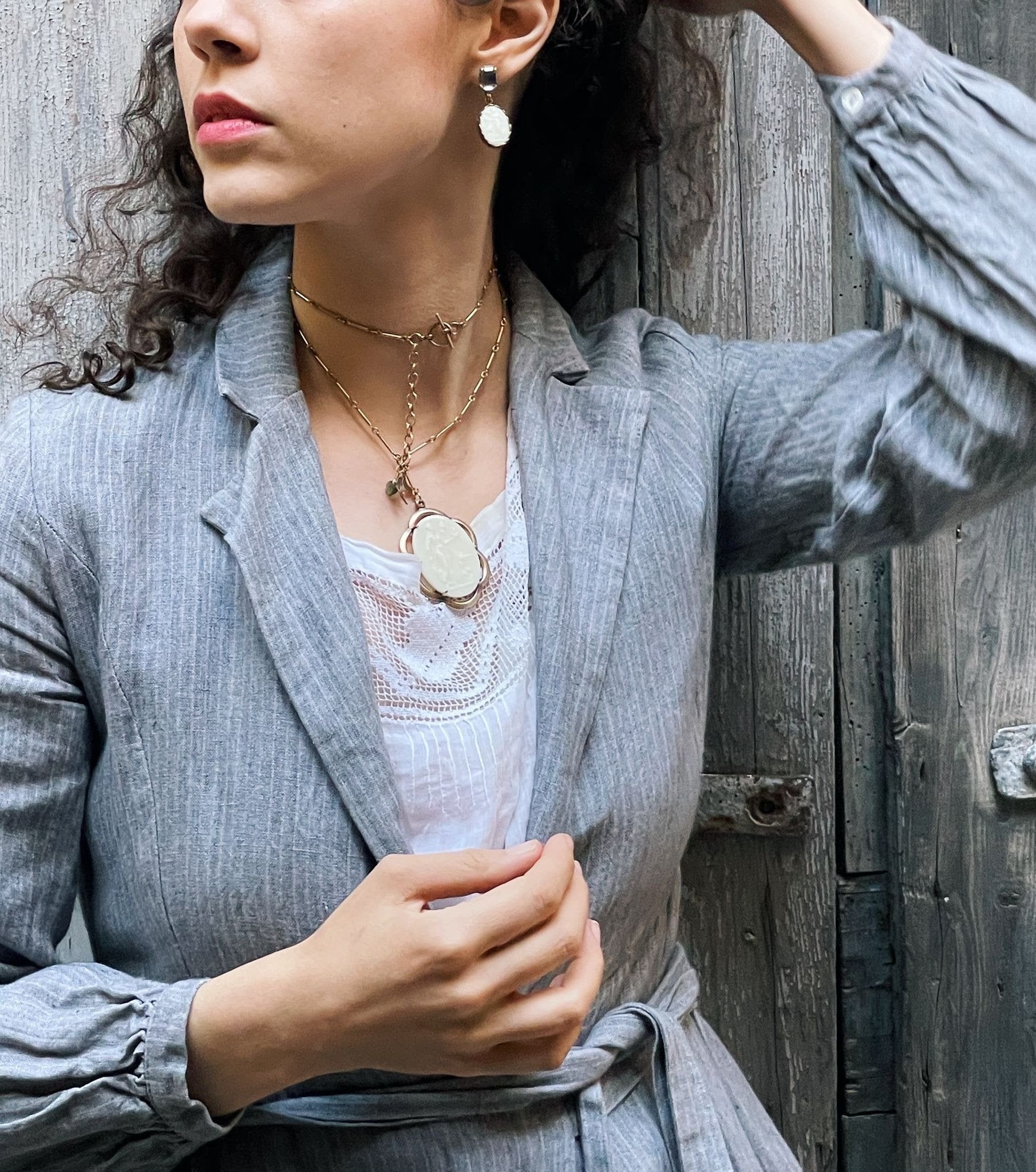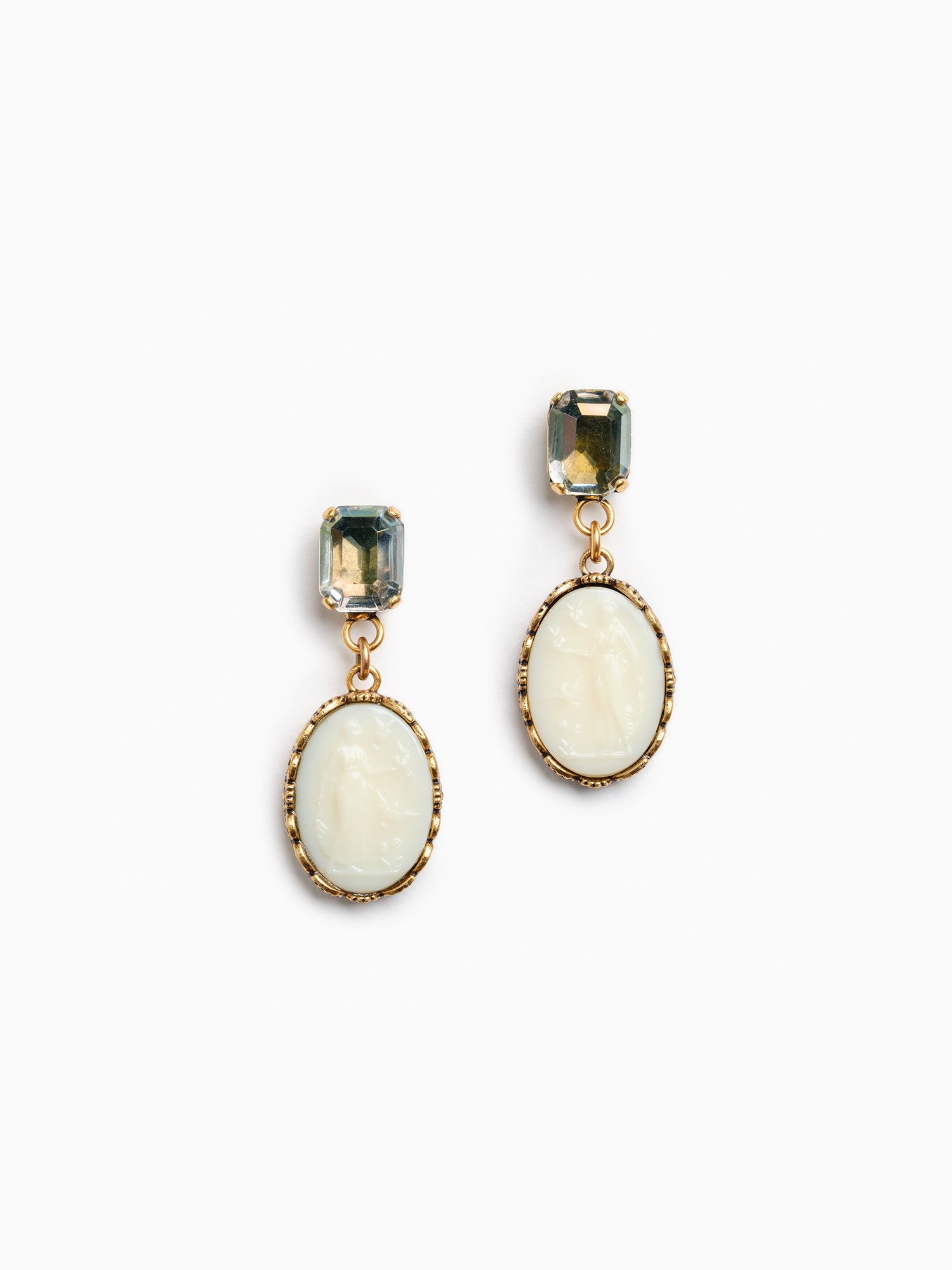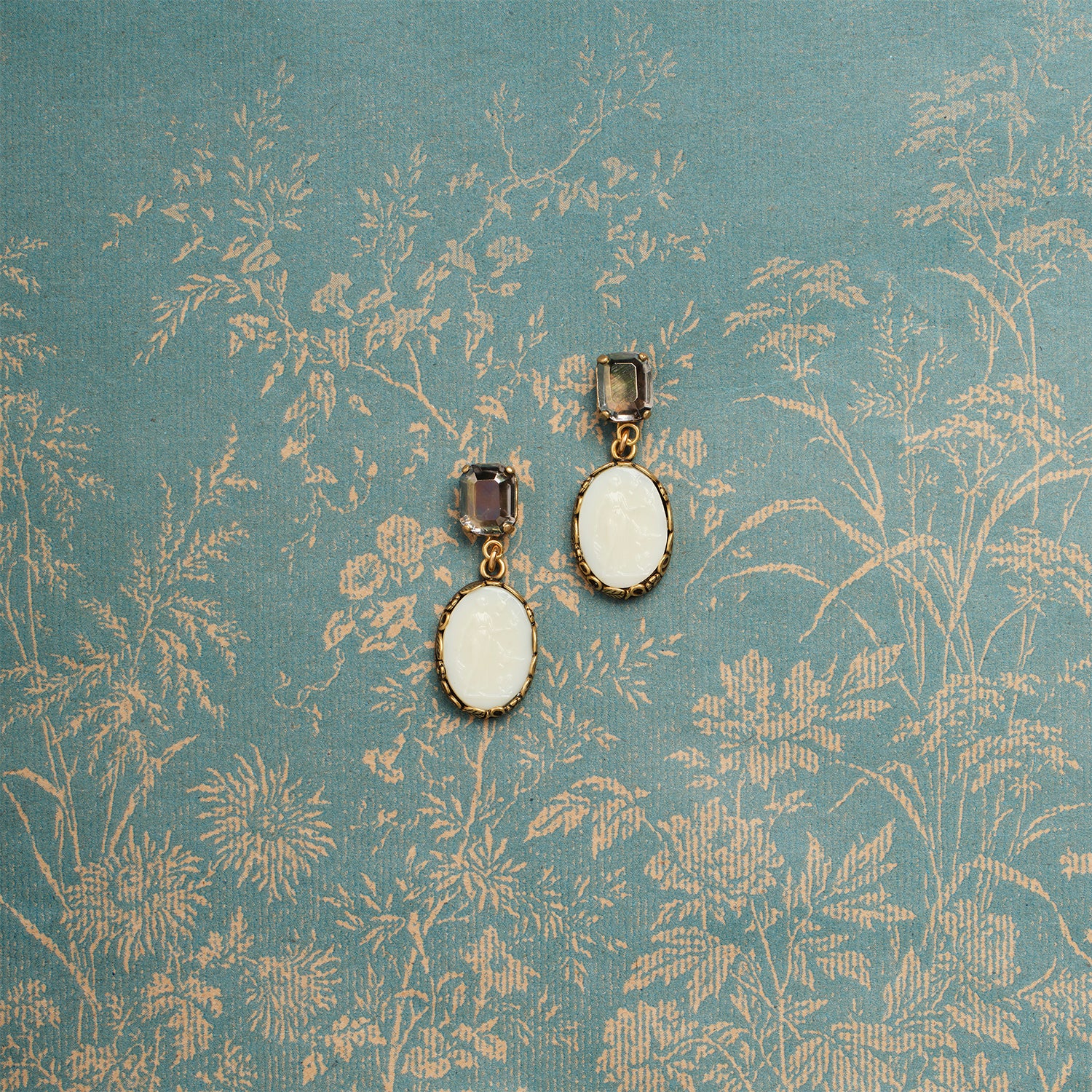 Cream-colored and classic, these petite earrings feature German glass cameos depicting a tranquil lady and her three doves, which offer a message of serenity and devotion to the wearer. Above rest a brilliant pair of crystals, adding a modern flair.