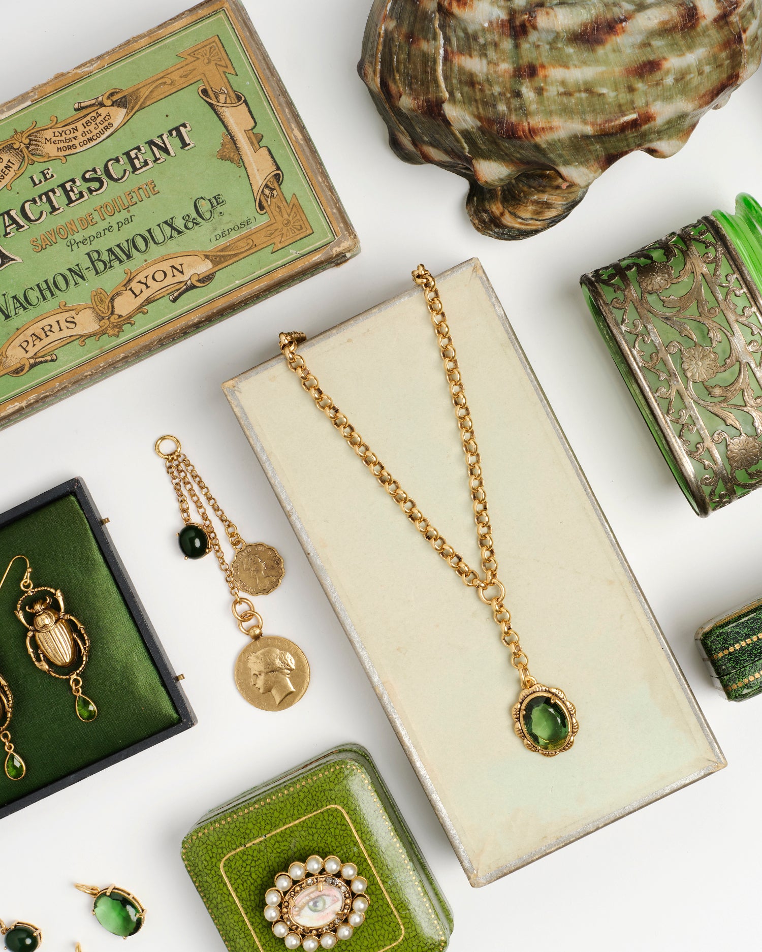 Simple, evocative, and set with a green stone to harken the tranquility of the natural world, this necklace is named for Princesse Mathilde who painted her own path in the Bonaparte legacy with watercolor and design.