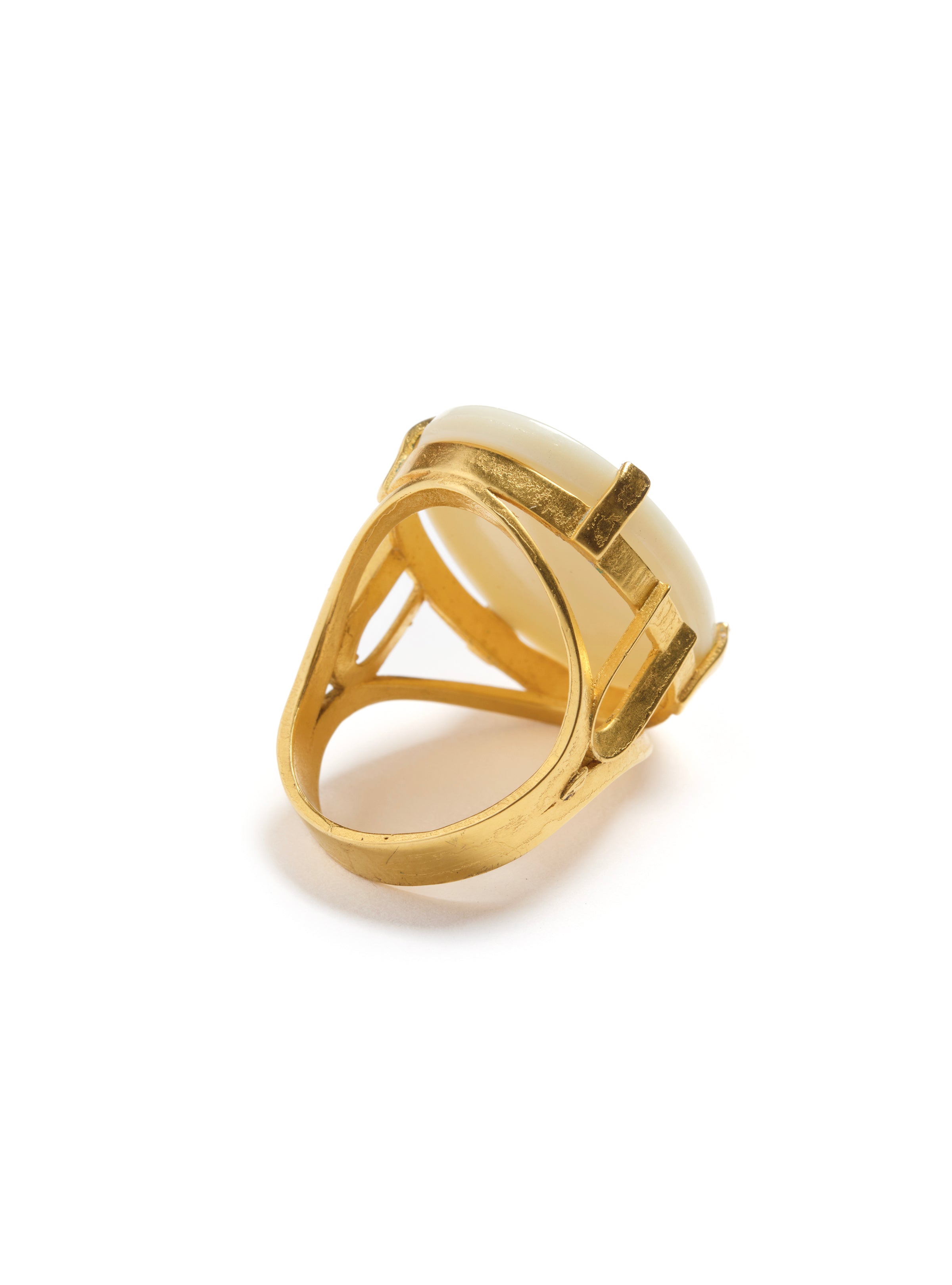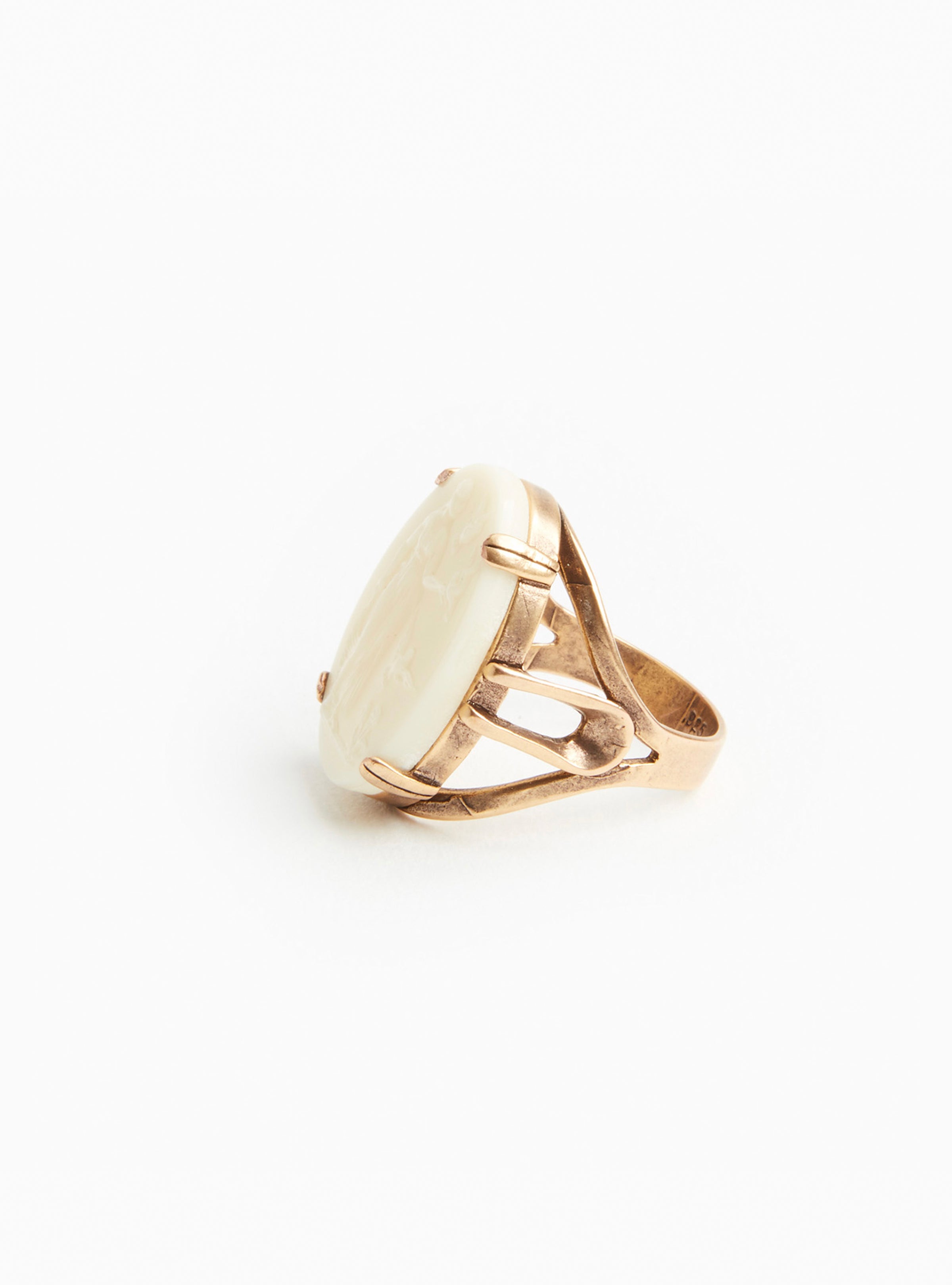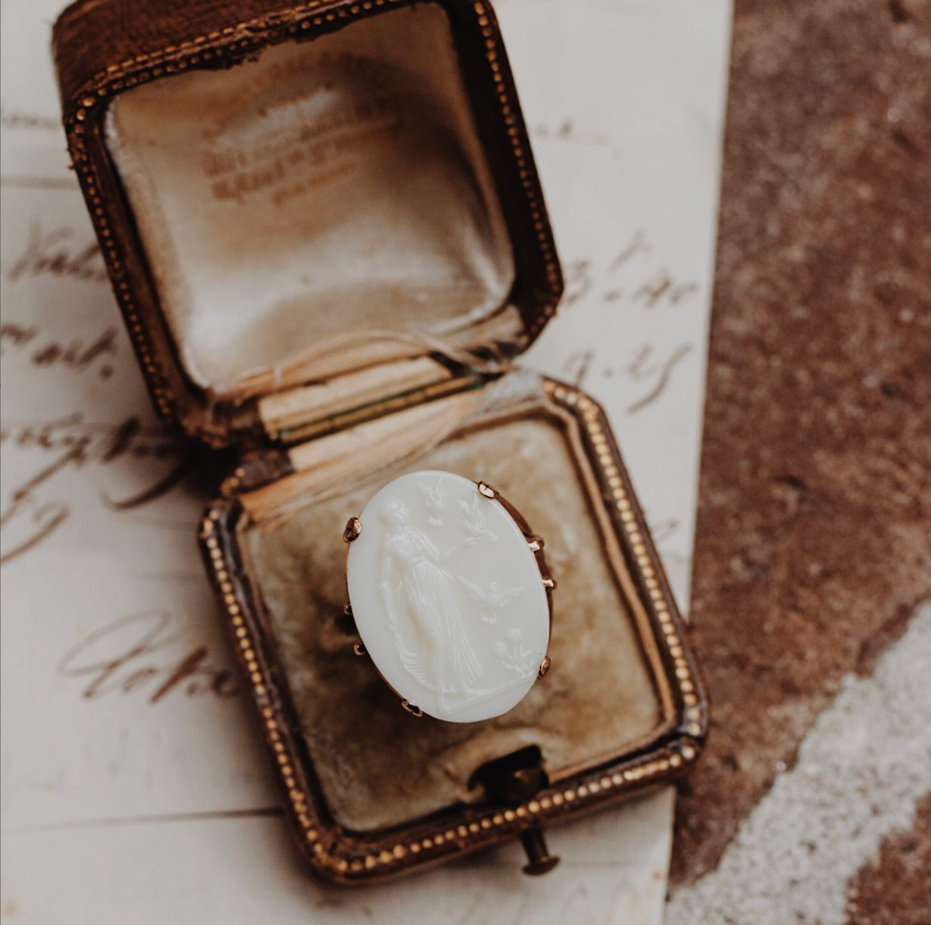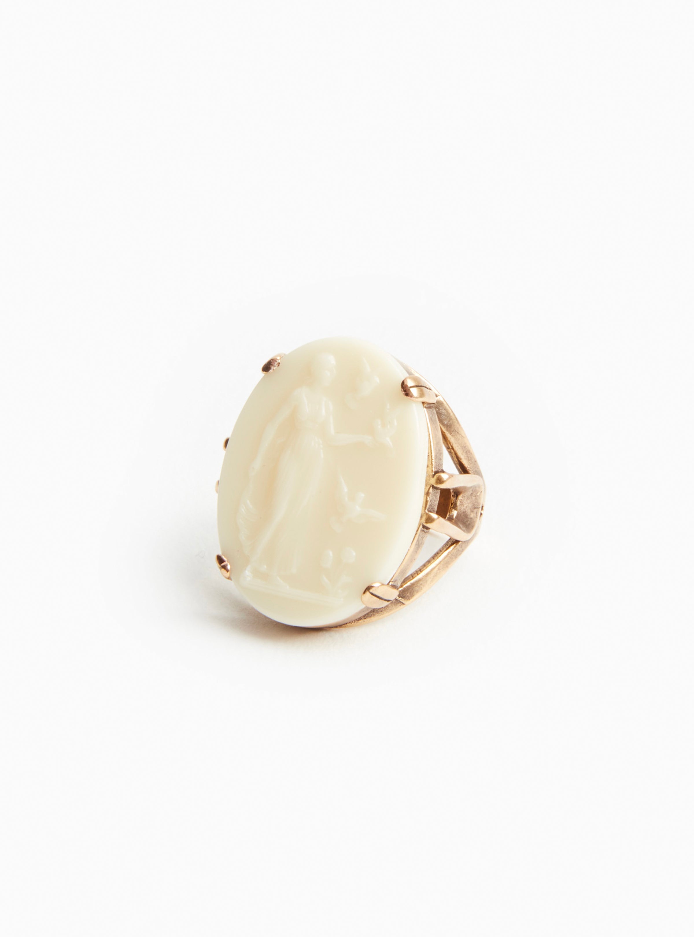 Cream-colored and classic, this German glass cameo depicts a tranquil lady and her three doves, offering a message of serenity and devotion to the wearer.