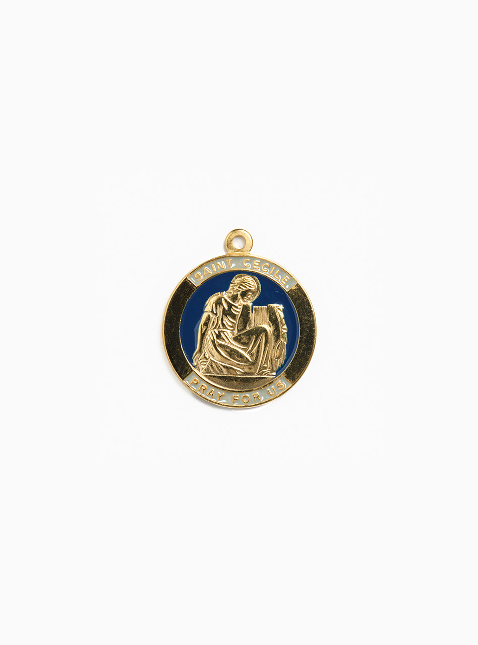 Patroness of music and the unseen harmonies that guide the soul, St. Cecile is rendered here in glowing relief: a golden figure encircled by deep blue enamel, like night sky framing a single brilliant note. A symbol of inspiration and artistry, Cecile invites the wearer to listen for the subtle rhythms in their own life.
