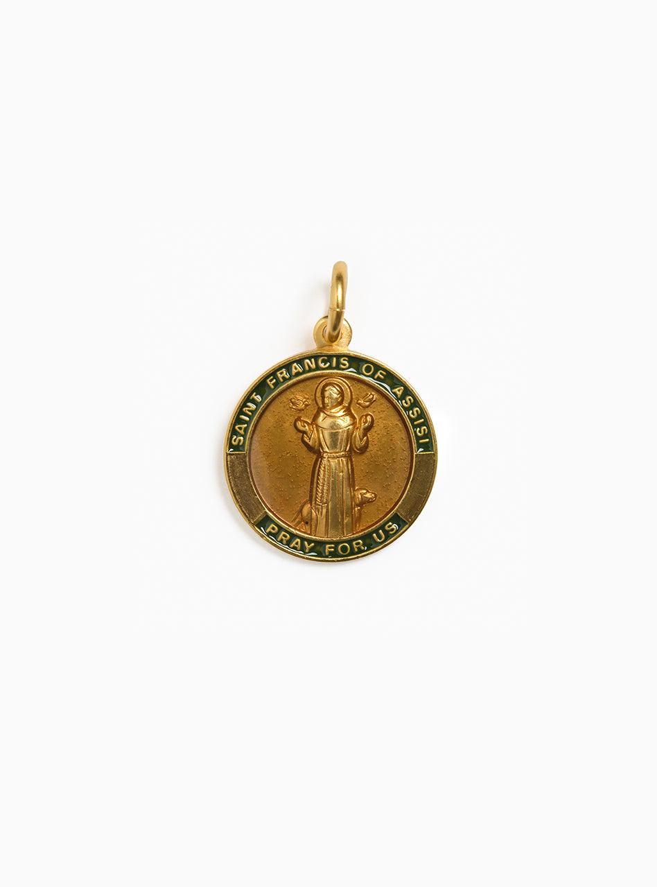 Drawn from an Italian devotional token, this charm shows Saint Francis in humble prayer, surrounded by small creatures at his hands and feet. As the patron saint of animals and peace, his presence conveys gentleness and stewardship.