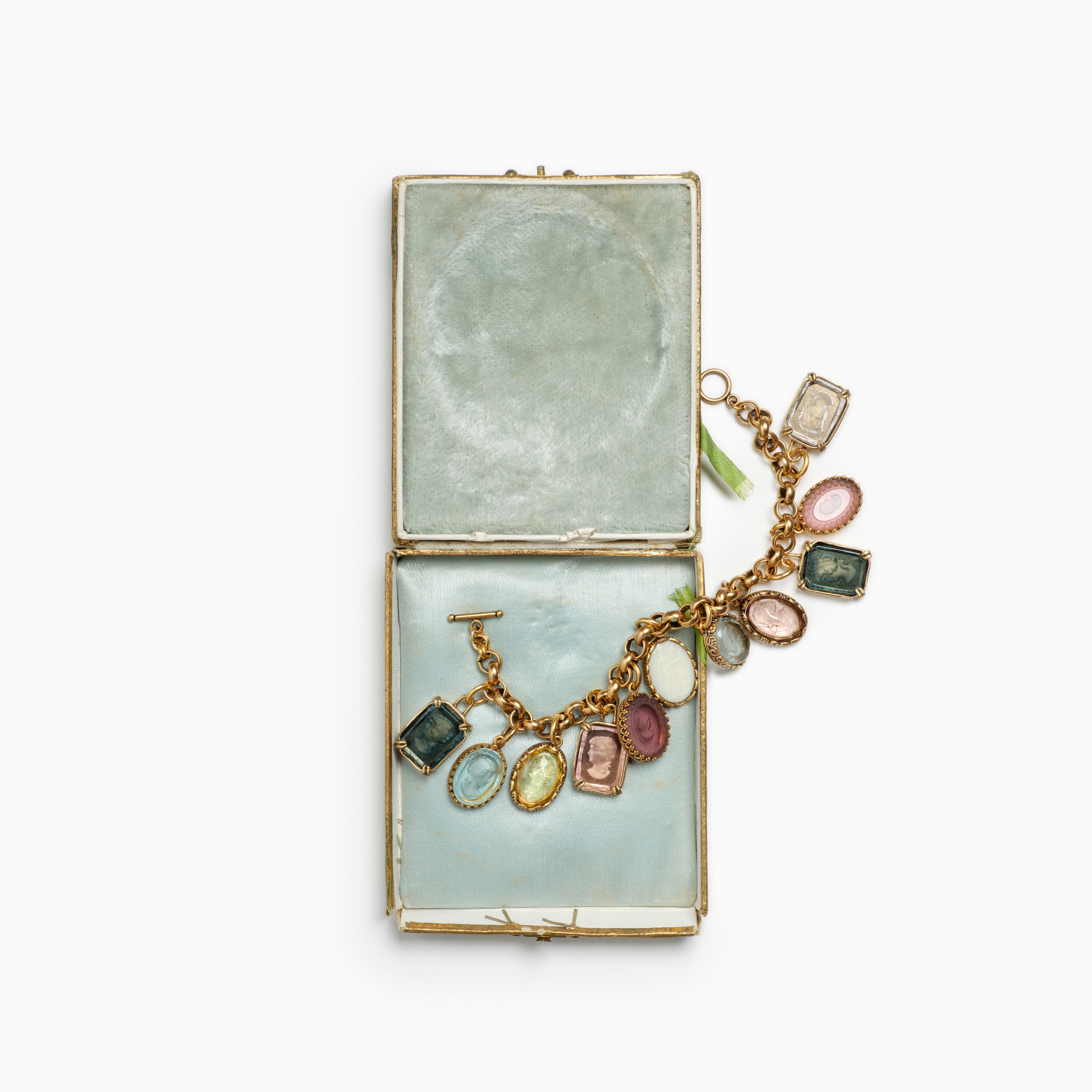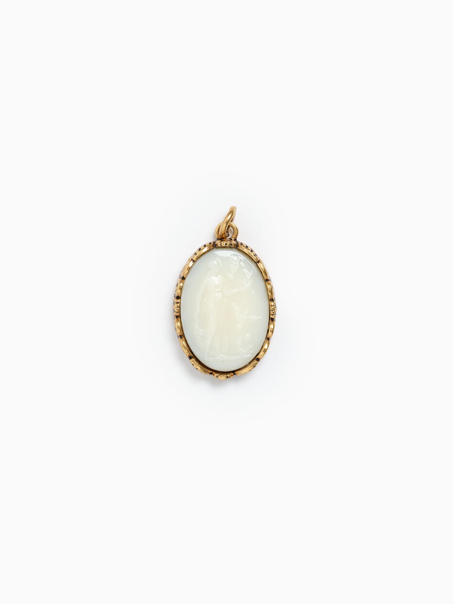 Cream-colored and classic, this charm features a German glass cameo depicting a tranquil lady and her three doves, which offer a message of serenity and devotion to the wearer.