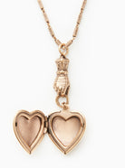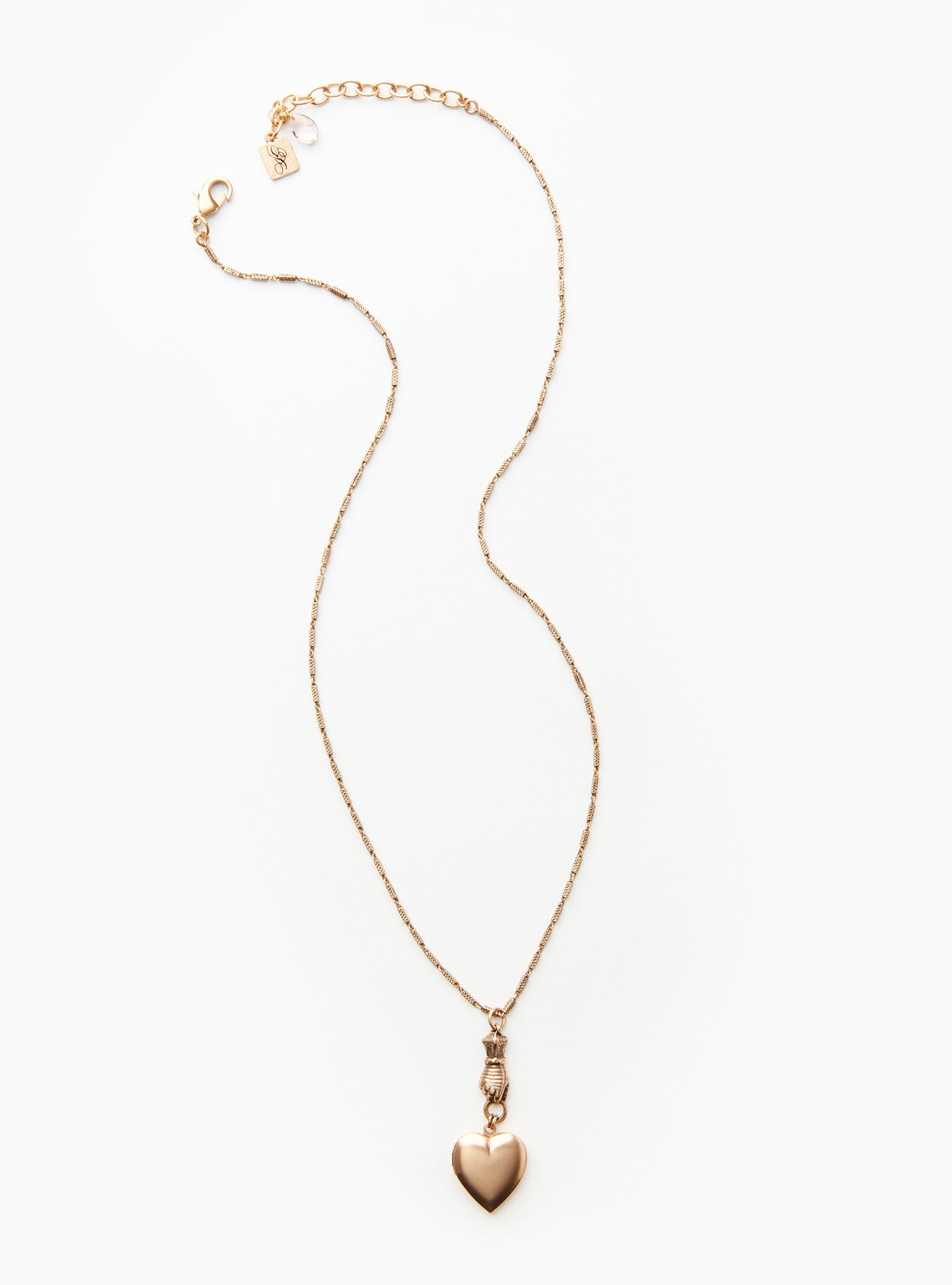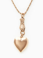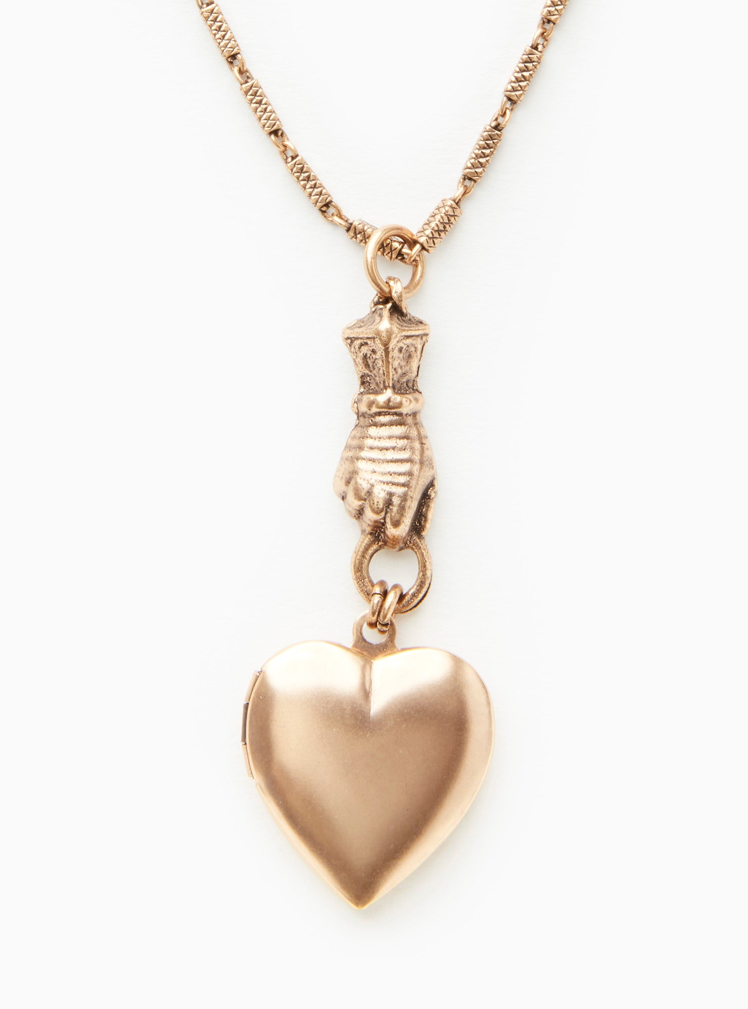 Functional heart locket, sculpted hand, and bar chain made of flash plated antiqued gold over brass.