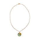 A slender 18k stick chain carries two quiet emblems of morning light: a sage green glass cameo, cool and tranquil as the first hours of daybreak, and a petite golden songbird in mid-flight. Together, they recall the stillness of Paris at dawn—where shadowed courtyards stir, and the hush is broken only by birdsong.