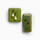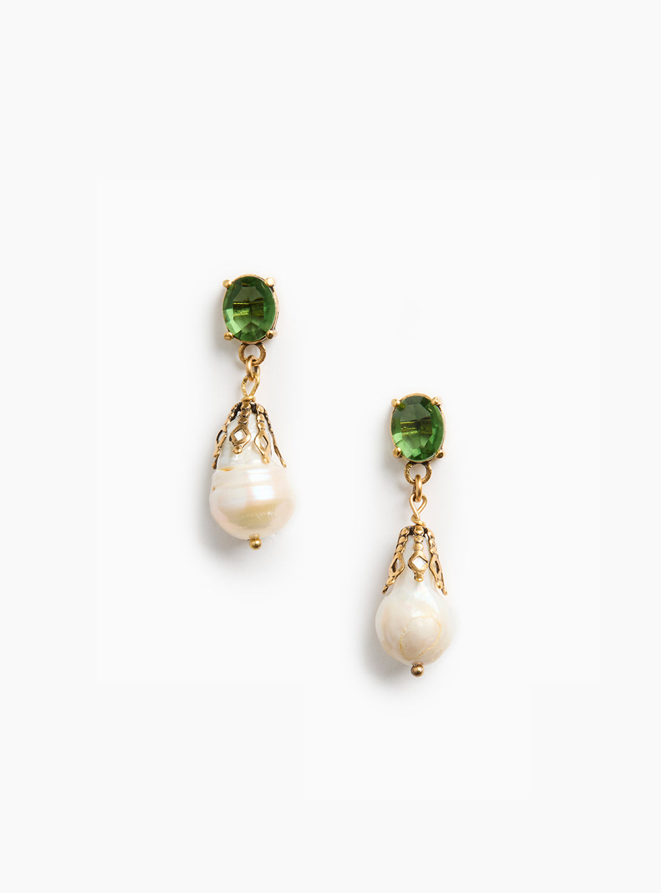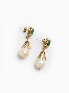 Inspired by the delicate, oblong pearl drop earrings found in oil paintings across Italy and France, these earrings begin as a brilliant green stone stud that drops into a freshwater pearl encased in gold. Romantic, soft, and sensual—worthy of a museum.